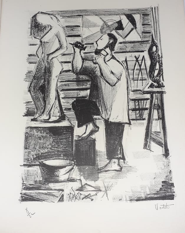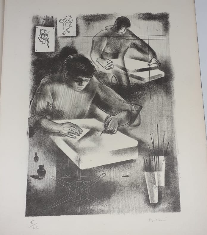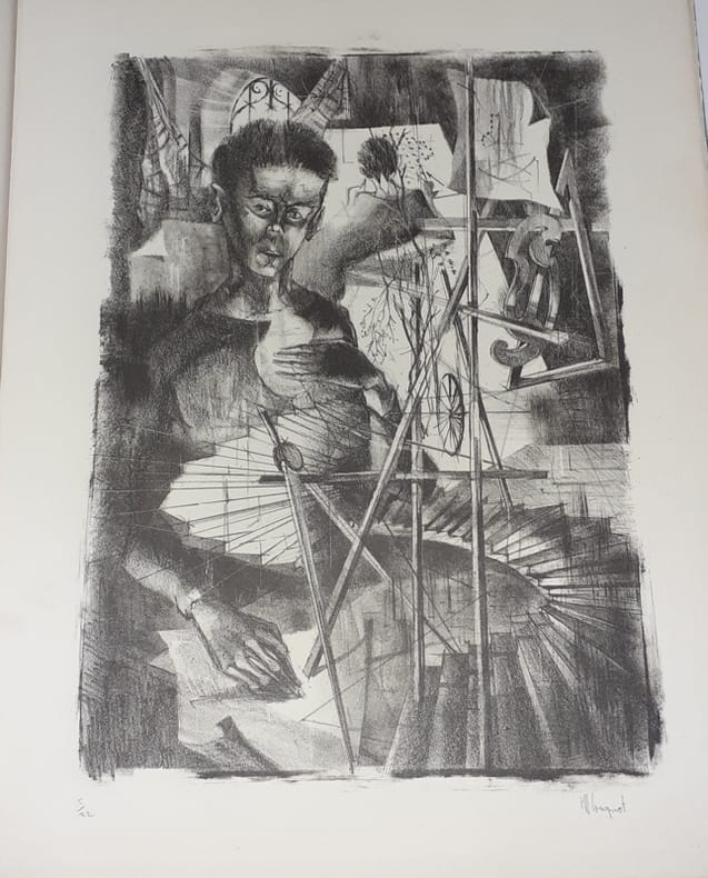 S.L., Atelier Henri Bossanne, s.d. (XXe). In-folio, en feuilles sous carton muet demi-chagrin vert, pp. de titre en coul., 2 pp. de texte, 14 (sur 15 annoncées) lithographies numérotées et signées au crayon par les artistes : Bichet, Brignot, Bourgeois, Robbe, Sala, Dodane, Voitot et Gaubert. Il manque «La Sculpture» de Desbordes. Tirage à 22 exemplaires seulement.