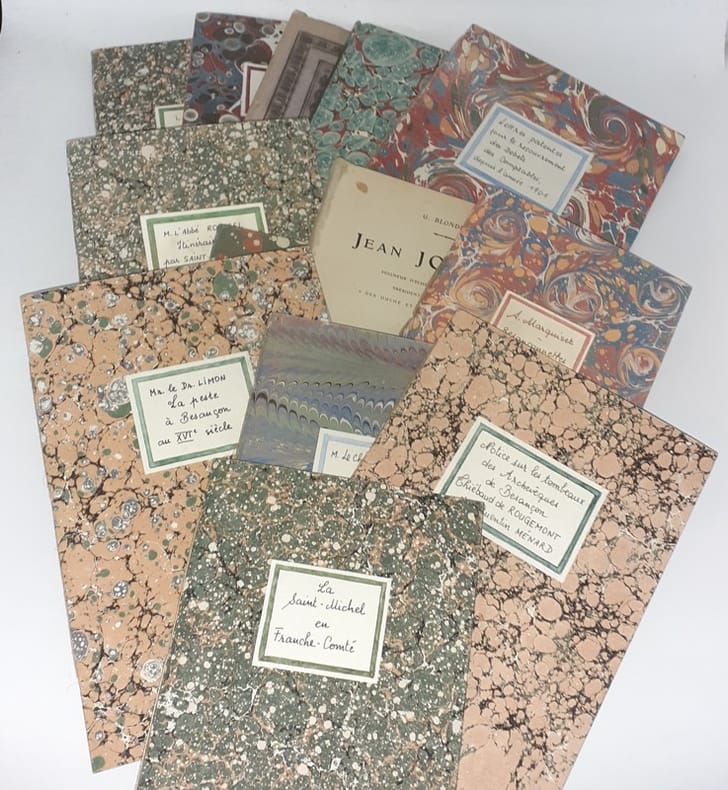 13 fascicules in-8 brochés : 1) Lettres patentes pour le recouvrement des Debets des Comptables depuis l'année 1701 par Berthelot, Rasle et Crevoiseret, Dole, Antoine Binart, 1711, [7] pp., qq. annotations manuscrites de l'ép. 2) Discours pour l'inauguration de sa Majesté Louis XVIII dans la ville de Salins, par l'Abbé Coulon le 15 Oct. 1816, Salins J.-B- Considerant, s.d., rel. moderne bradel plein-papier caillouté bleu, 20 pp. 3) Inauguration fu portrait de S. M. Charles X à Dole, département du Jura, discours par M. Dusillet, maire, Dole, Imprimerie J.-B. Jolly, 1828, 16-[1]-9 pp., Armes du Roi gravé au titre et en tête, gravure avec portrait du Roi bandeau du l'ode au Roi, 1 planche gravée pour la partition du chant créé pour l'inauguration, partition complète du chant. 4) Eloge de l'Abbé X. Brocard, par M. Claude, Besançon, [1848], 16 pp., ex. libris manuscrit en tête de la couv. sup. 5) L'imprimerie en Franche-Comté, son origine et ses développements 1485-1793, par L. de Sainte-Agathe, Besançon, Dodivers et Cie, 1872., envoi manuscrit de l'auteur en tête de la couv. sup., tampon ex. libris au titre. 6) La Saint-Michel en Franche-Comté, signé Charles de Chaumercenne, Vesoul, Tabouillot et Cie, 1881, 40 pp. 7) Notice sur les tombeau des Archevèques de Besançon, Thiébaud de Rougemeont et Quentin Ménard. S.l., s.d. [vers 1875], pp.434 à 448, 2 pl. dont 1 dépliante. 8) Hugues Ier, Archevèque de Besançon, par J. Rossignot, Besançon, Jacquin, 1904, 28 pp., 1 pl. 9) Les mesures contre la peste à Besançon au XVIe siècle par le Docteur Limon, Bensançon, Dodivers et Cie, 1906, 21 pp., envoi autographe de l'auteur. 10) Besançonnettes par Alfred Marquiset, Besançon, 190945 pp., 22 poèmes. 11) Jean Jouard, Seigneur d'Echevannes et de Gatey par G. Blondeau, Besançon, Dodivers, 1909, 112 pp. 12) Examen critique d'un récent travail historique sur Dole par Julien Feuvrier, Dole, 1910, 16 pp. 13) Itinéraire suivi par Saint Colomban d'Irlande en Gaule par l'Abbé Roussel, Besançon, Jacques et Demontrond, 1930, 19 pp.
