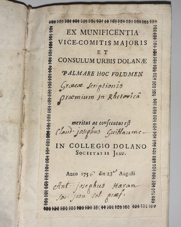 S.l., 1751. In-12, rel. de l'ép. plein veau glacé marbré, dos lisse, caissons dorés ornés d'un fleuron doré, pièce de titre brune, titre doré, filet doré sur les coupes, blason doré de la ville de Dole au centre des plats, tranches marbrées ; 366 pp., bandeau, lettrine et culs-de-lampe, table en exergue, sans le portrait de l'auteur au front. Etiquette ex-libris, étiquette contrecollée en pp. de garde datée du 23 Août 1756 rédigée en latin : " Grâce à la générosité du vice-comte-maire et des consuls de la ville de Dole, ce volume a reçu le prix de rhétorique décerné par Claude Joseph Guillaume au collège de Dole de la Compagnie de Jésus ". Signée et datée : Joseph Haran. Première édition.