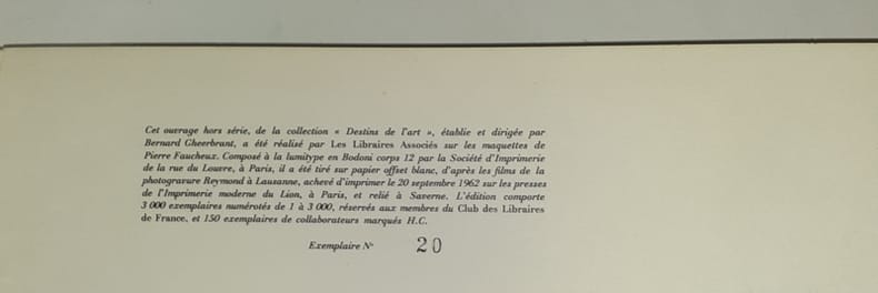Cet ouvrage hors série de la collection " Destins de l'art ", établie et dirigé par Bernard Gheerbrant, a été réalisé par les Libraires Associés sur les maquettes de Pierre Faucheux. Composé à la lumitype en Bodoni coprs 12 par la Société d'Imprimerie à Paris, il a été tiré sur papier offset blancs, d'après les films de la photogravure Reymond à Lausanne, achevé d'imprimer le 20 septembre 1962 sur les presses de l'Imprimerie moderne du Lion à Paris, et relié à Saverne. L'édition comporte 3000 ex. numérotés de 1 à 3000, réservés aux membres du Club des Libraires de France, et 150 ex. de collaborateurs marqués H.C. Notre ex. porte le N° 20. Dos insolé, plats et tr. sup. un peu piqués et poussiéreux, bel ex. au demeurant. - Frais de port : -France 6,9 € -U.E. 11 € -Monde (z B : 18 €) (z C : 31 €)