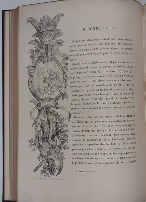 Paris, Gavard, s.d. (fin XIXe). Fort in-4, rel. éd. pleine-toile bleue nuit, décors à la cathédrale dorés au dos et sur les plats, tranches dorées; XLIV-300 pp., 3 pl. sous serpentes dont le front., très belles gravures en ornement tout au long des pp., avertissement de l'éditeur, essai sur J.-B. Massillon en exergue, notes historiques in fine. Ex-dono manuscrit ancien (1811).
