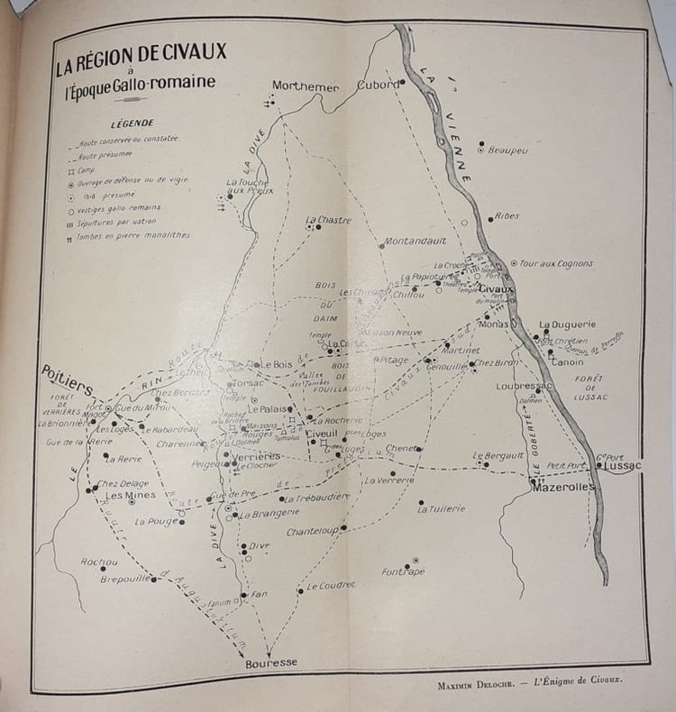 Paris, Auguste Picard, 1924, Première Edition, in-8, br., IX - (1) - 272 - (4) pp., ill. de photos en noir hors texte et de deux cartes (dont 1 dépliable), L'histoire de Civaux (Vienne) au temps des Lemovices et des Pictons et dirigée par Rome. Ville de grand passage, par route et par la Vienne, où existait une très grand activité commerciale grâce à son marché. Couv. et int. Défraichis; non coupé;