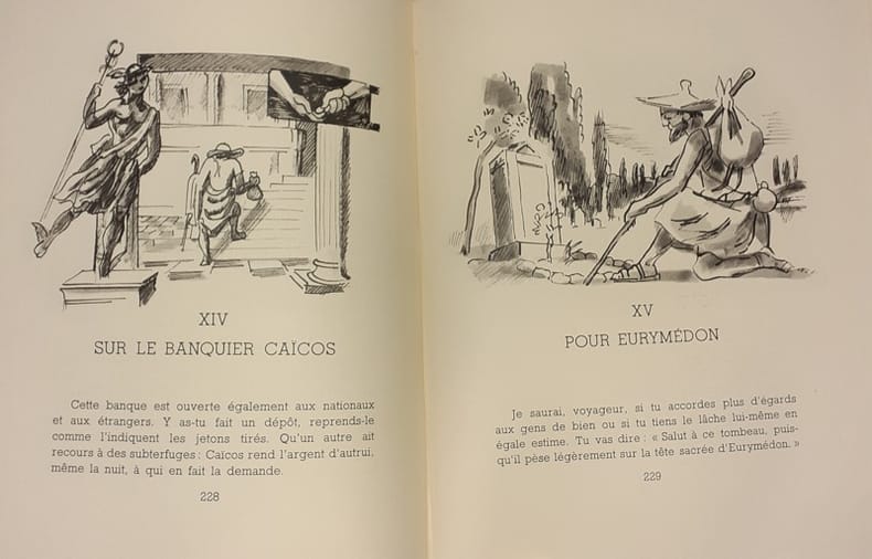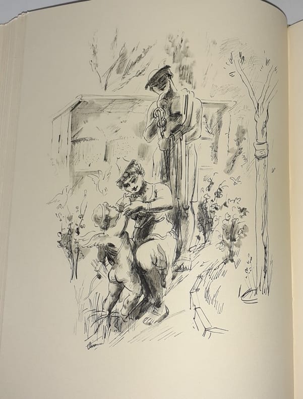 Lausanne, Editions du Bibliophile, 1946. In-4, rel. de l'éd. plein-chagrin noir sous étui bordé, dos lisse, titre doré, tête dorée ; 244 pp., 12 dessins h.-t. et 40 dessins in-t. au roseau en n/b. Edition tirée à 1600 ex., tous numérotés, celui-ci un des 1585 sur vélin (n° 907). Ex-libris illustré.