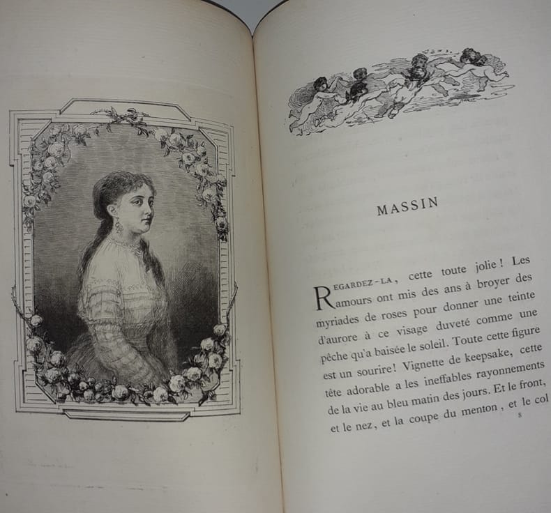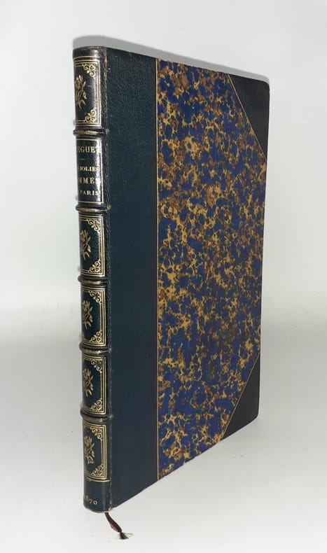 Paris, Jouaust, 1870.Un volume relié (15,5x24 cm) de 120 pages. Reliure demi-chagrin rouge à coins; dos à nerfs ornés, titrage doré, tête et tranches dorées. Reliure usée, frottements et épidermures, intérieur en très bel état.Volume illustré de 20 eaux-fortes par Martial, et d'ornements par Morin. Frontispice. Édition originale un des 50 exemplaires numéroté de tête, tirage spécial sur grand papier in-4° raisin. Très charmant ouvrage, joliment relié. L'auteur y propose 20 petits portraits, sous forme de "camées" littéraires, des femmes célèbres du Paris de son temps. On y retrouve, entre autres, Sarah Bernhart, Rosine Bloch, Céline Montaland... Chaque portrait est accompagné d'une eau-forte.