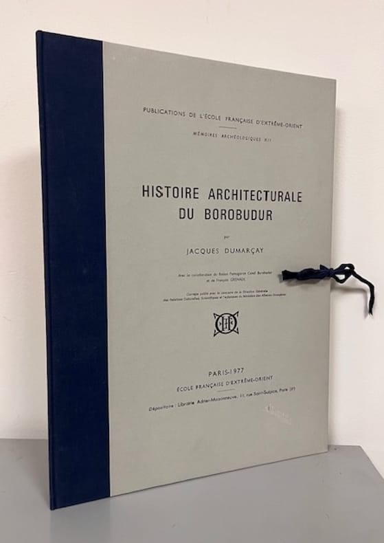 Ecole Française d'Extrême-Orient 26,5 x 36,5 Paris 1977 Demie reliure de toile bleue, plats cartonnés noués d'un lien bleu, étui à rabats contenant en feuilles, titre cartonné, 85 p., LXXX planches et 47 photos en noir et blanc. Mémoires archéologiques XII. Histoire architecturale du temple Borobudur de l'île de Java en indonésie. Exemplaire à l'état quasi neuf.(EvHome13)