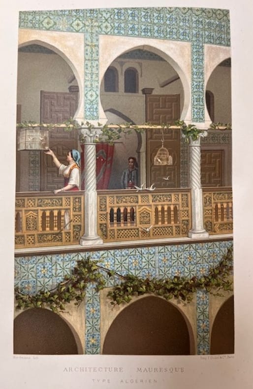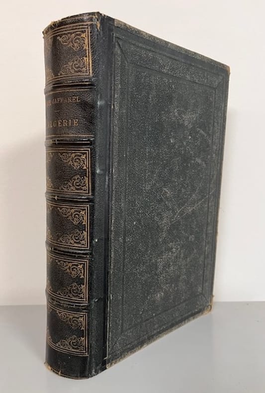 Firmin-Didot et Cie 1883 In-4 demi-chagrin à coins, dos à nerfs, caissons richement ornés, tête dorée, II- 708 pp. Près de 200 gravures, 22 hors-texte dont 4 chromolithographies, 3 cartes couleurs. Menus frottements. Bon exemplaire. I. Histoire de la conquête 1830-1832. Résistance turque : prise d’Alger ; premières années d’occupation ; prise de Constantine. Résistance arabe : puissance d’Abd-el-Kader ; Abd-el-Kader et Bugeaud ; insurrections arabes. Résistance nationale: guerre contre les Kabyles; la conquête du Sahara. II. Géographie de l’Algérie, physique, économique, politique. Les colons. Les indigènes; les cultes; la justice; l’instruction publique; les finances; géographie descriptive.