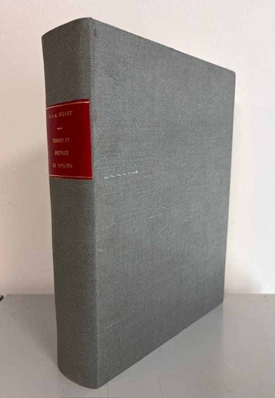 Milieu géographique, histoire et économie, démographie et vie sociale, études régionales des différentes communautés, et postface sur l'avenir ("Sumatra et les Pays-Bas"); index; bibliographie. Ouvrage de référence sur l'île de Sumatra, enrichi d'une abondante iconographie, gravures et photos: nombreuses vignettes, cartes et graphiques in texte ("150" annoncés), 88 planches hors texte de photos (bien conformément à la liste figurant dans l'ouvrage, "180 planches" étant curieusement annoncées sur le titre), grande carte couleurs dépliante et belle couverture décorée de motifs indonésiens. Ouvrage publié par le géographe belge Octave J. A. COLLET, ayant obtenu le prix triennal "Maurice Rahir" décerné par la Société royale belge de géographie. Tirage à 1000 exemplaires sur vergé (non justifiés). Bon exemplaire relié, bien complet des planches et de la grande carte.