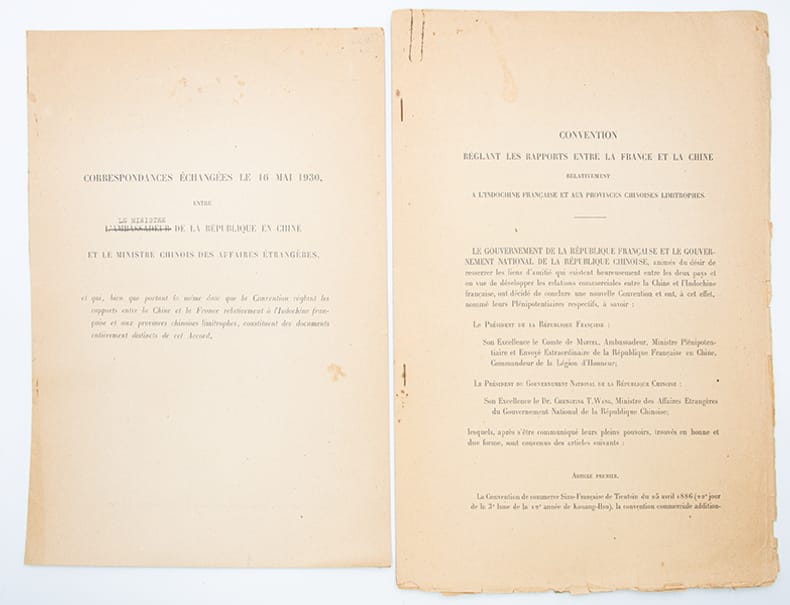 Correspondance échangée dans les années 1930, marquées par une profonde réorganisation des relations franco-chinoises, dans un contexte dinstabilité politique en Chine, sous le gouvernement nationaliste de Tchang Kaï-chek, et de redéfinition des concessions étrangères.Henri Cosme, comte de Martel (1881-1945), diplomate de carrière, est alors ambassadeur et ministre de la République française en Chine. Il représente la France auprès du gouvernement chinois à Nankin.Chengting T. Wang (Wang Zhengting ), homme politique et diplomate chinois formé aux États-Unis, occupe à plusieurs reprises le poste de ministre des Affaires étrangères, notamment de 1928 à 1931 sous le gouvernement nationaliste. Figure centrale de la diplomatie chinoise modernisatrice, il sattache à renégocier les traités inégaux imposés au XIXe siècle par les puissances étrangères.Important document.Papier un peu bruni. Quelques petits accrocs de papier.