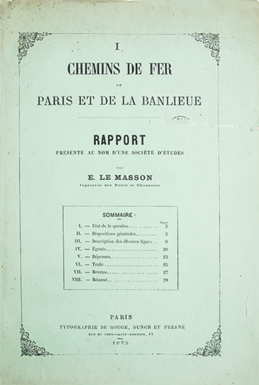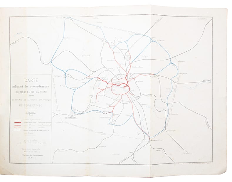 Édition originale, illustrée dun grand plan dépliant en couleurs du réseau ParisBanlieue. Lauteur, ingénieur des Ponts et Chaussées, y expose un vaste projet de desserte ferroviaire autour de la capitale.Le rapport aborde successivement : létat de la question, les dispositions générales, la description des différentes lignes, ainsi que des sections consacrées aux égouts, aux dépenses, au trafic et aux revenus prévisionnels.On joint trois fac-similés de lettres à en-tête de la Société dÉtudes de Chemins de Fer de Paris et de la Banlieue, dont une adressée au préfet pour la présentation officielle du projet.Quelques accrocs de papier à la couverture, sans manque.Un unique exemplaire est recensé dans les bibliothèques françaises : celui conservé à la BnF.