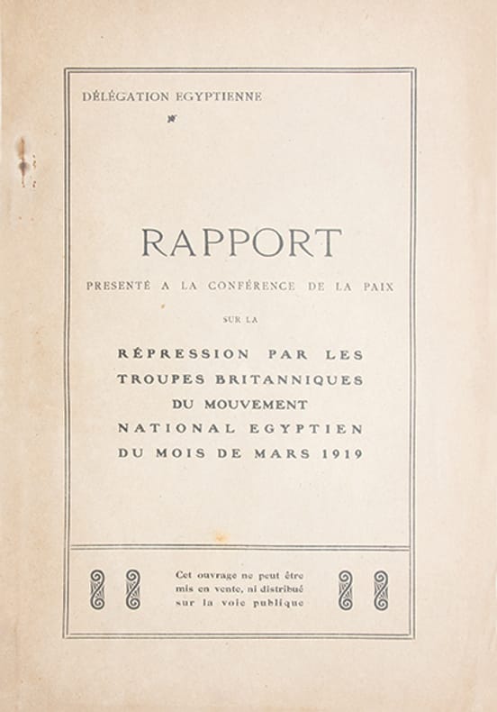 Recueil de trois pièces officielles : les réactions du jeune mouvement national égyptien à la suite de la décision prise lors de la "Conférence de la paix" de confirmer le protectorat de la Grande-Bretagne sur lÉgypte et des premiers mouvements insurrectionnels qui s'en suivirent.Présenté à la Conférence de la paix, le premier rapport concerne les événements de mars 1919 : après l'arrestation et l'exil de trois dirigeants du Wafd (parti nationaliste égyptien), de graves troubles secouèrent l'Égypte causant un millier de morts égyptiens et trente du côté anglais. Les 3 planches de photos représentent des sévices infligés par les Anglais à des citoyens égyptiens.