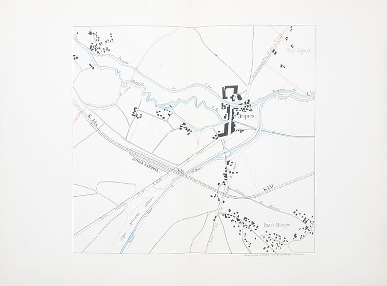 8 pièces in-folio (310 × 220 mm), brochées : 2 pièces de 4 pages de texte chacune et 6 plans rehaussés à laquarelle, imprimés sur double page sur papier vélin fort ; lensemble est réuni sous une chemise de léditeur imprimée. Paris, Autographie Broise, 1870.