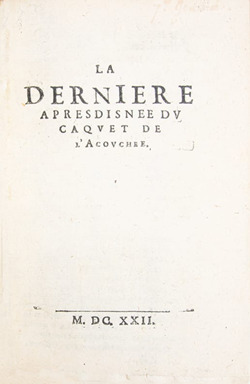 Suite anonyme du célèbre 'Caquet de laccouchée', Le titre fait référence à la coutume qu'avaient les bourgeoises de se visiter lorsque l'une d'elles était en couches. Le narrateur, un Parisien en convalescence à qui son médecin prescrit de se distraire, se rend rue Quincampoix et restitue les caquetages et commérages des femmes entourant sa cousine qui vient d'accoucher. Chronique acerbe de la vie parisienne où se mêlent des considérations sur les personnalités de l'époque, citées nommément, la politique, la religion, l'économie, les moeurs, etc. Le texte est considéré comme une bonne source sur la vie quotidienne et les représentations de la femme dans ce premier quart du XVIIe s. Cf. P. Brun, 'La Bourgeoisie au XVIIe siècle d'après Les Caquets de L'accouchée', Revue d'Hist. Litt. de la France, n°2, 1896, p. 192-203.(Arbour, 10458. Lindsay et Neu, 4732.Mercier, 'La litt. facétieuse sous Louis XIII', n°87).Bon exemplaire.
