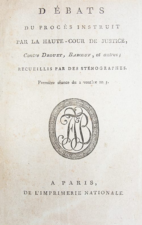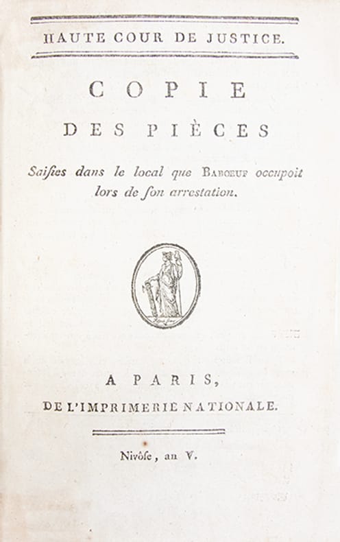 Exceptionnel ensemble des sept parties constituant la source imprimée principale pour lhistoire de la "Conjuration des Égaux", considérée comme la première grande tentative de conspiration communiste organisée.1- Edition originale. Le premier tome contient la première publication du "Manifeste des Égaux" (p. 159 et suiv.), dont la rédaction est attribuée par Buonarroti à Sylvain Maréchal.Présenté comme la "première tentative pour faire entrer le communisme dans la réalité sociale", ce manifeste pose les fondements dune doctrine égalitaire et athée, basée sur la gestion communautaire des biens et des moyens de production. Il prône la prise du pouvoir par la révolution, suivie dune période transitoire de dictature populaire devant conduire à linstauration dune démocratie directe universelle.Cest essentiellement sur les documents et pièces réunis dans ces volumes que la Haute Cour de Justice fonda son accusation, laquelle aboutit à la condamnation à mort de Babeuf.2- Edition originale. La présence, parmi les prisonniers du Directoire, de Jean-Baptiste Drouet, député au Conseil des Cinq-Cents, imposait constitutionnellement le jugement des babouvistes et de leurs alliés devant une Haute Cour encore inexistante au moment des arrestations. Le procès ne souvrit à Vendôme que le 14 vendémiaire an V (5 octobre 1796).Le 7 prairial an V (26 mai 1797), Babeuf et Darthé, lequel avait prévu, dans le plan insurrectionnel, lexécution des membres du Directoire, tentèrent de se suicider à laide dun petit couteau remis clandestinement par le fils de Babeuf. Grièvement blessés, ils furent néanmoins guillotinés le lendemain.La première partie du tome quatrième est intitulée : "Discours des accusateurs nationaux, défenses des accusés, et de leurs défenseurs, faisant suite aux débats du procès instruit" (378 p.). La seconde partie porte le titre : "Résumé du président de la Haute-Cour de Justice, à la suite du débat, dans laffaire du représentant du peuple Drouet, de Baboeuf et autres" (134 p.).Lensemble constitue un témoignage capital sur le fonctionnement de la justice révolutionnaire sous le Directoire, ainsi que sur lélaboration précoce dune pensée communiste structurée, dont Babeuf apparaît comme la figure centrale.(Daline, Saitta et Soboul, "Inventaire des manuscrits et imprimés de Babeuf", p. 101, n° 55, et p. 102, n° 51 et 52. Dommanget, "Sylvain Maréchal", p. 459. Monglond, IV, 42 et 43).Rousseurs parfois soutenues. Quelques accrocs aux coiffes et aux mors. Ex-libris armorié gravé aux armes de Paris (Ancien Régime), écu écartelé chargé de lions, châteaux et épées, soutenu par un lion couronné, avec devise "Deo, Patria, Rege".Bon exemplaire en reliure uniforme de lépoque.