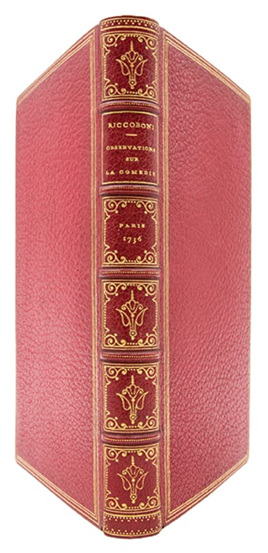 Edition originale et unique ancienne. "Premier historien de la comédie", Riccoboni se propose d'étudier la comédie comme genre autonome sous ses aspects et ses registres les plus divers et d'examiner son évolution à travers la carrière et la production de Molière, pris comme modèle exemplaire insurpassé "dans tous les genres dont la comédie est susceptible". "Véritable essai de poétique du genre, ce texte, qui reste encore aujourd'hui méconnu (), est basé sur une expérience de la scène et de l'écriture qui font de lui une autorité" (Stéphanie Massé, 'Les saturnales des lumières', Thèse U. du Québec, 2008, p. 198).Comédien italien, auteur dramatique et théoricien du théâtre, Louis Riccoboni, dit "Lélio" vint en France à la tête de sa troupe à la demande du Régent (1716), devint directeur de la Comédie-Italienne et connut une immense et durable gloire.(X. de Courville, 'Un apôtre de l'art du théâtre au XVIIIe s.: L. Riccoboni', Bibliographie, n°78. Soleinne, V, n°401).Très bel exemplaire, très frais, dans une éclatante et élégante reliure de maroquin rouge de Charles François Capé.