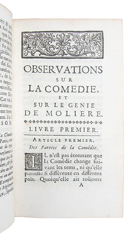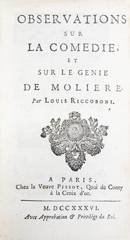 Edition originale de cet essai de critique, parfaitement structuré sur la comédie. L'auteur qui était un comédien et auteur italien venu en France en 1716, directeur de la comédie italienne, y dresse une analyse structurée du genre du point de vue littéraire. L'ouvrage est divisé en quatre parties qui traitent successivement des parties de la comédie, de la farce, de la comédie ancienne en général, et de la parodie. Riccoboni y donne la première analyse littéraire des pièces de Molière. Ses observations seront reprises en 1786 par Calhava de l'Estandoux dans son Art de la Comédie. Bel exemplaire. Cioranescu, 53002; Conlon, 36:638; De Filippi, n°1404; Despois & Mesnard (Molière), p. 203.