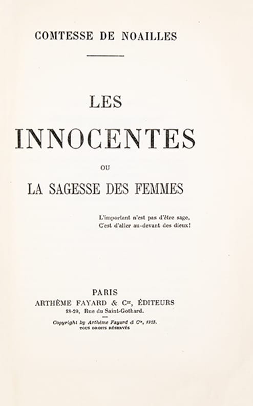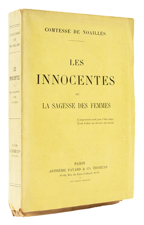 Edition originale tirée à 640 exemplaires. Un des 325 sur papier vélin pur fil Lafuma."Succession de confidences qui se lisent comme testament amoureux d'Anna de Noailles. Dans une oeuvre essentiellement poétique, il s'agit de son seul recueil de nouvelles. Elle le publie à quarante-sept ans. La part de soi, celle de ses élans de femme (), les quinze textes courts des 'Innocentes' sonnent juste. Succession de pensées intimes, de dialogues imaginés, de lettres jamais envoyées, ces petits contes parlent du trouble, de la passion, de la fidélité, du mensonge et des aveux. C'est féministe avant la lettre. On dirait aujourd'hui : 'C'est du vécu'. " (Buchet Chastel, 2009).Très bel exemplaire, très bien relié, parfaitement conservé, relié sur témoins et non coupé.Bon exemplaire, bien conservé, non rogné, témoins conservés.