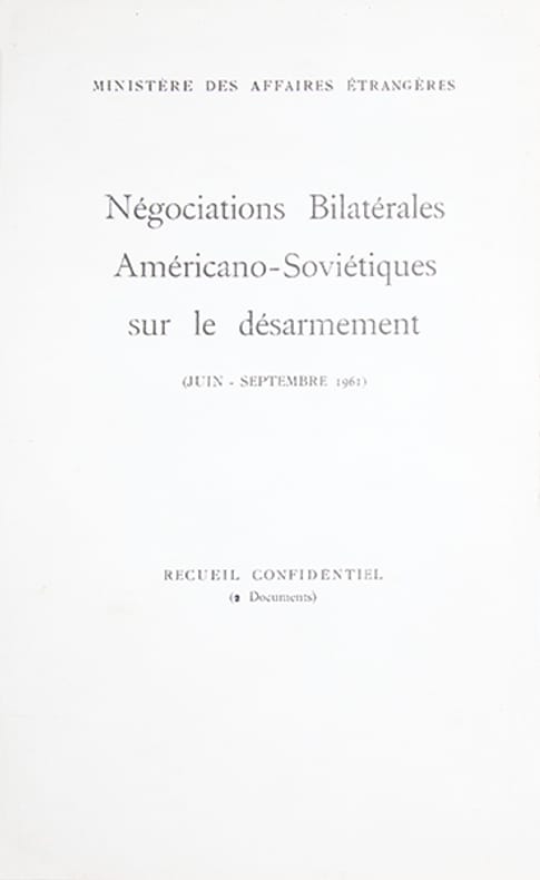 Publication interne portant la mention "Recueil confidentiel". Rapport officiel consacré aux pourparlers entre les États-Unis et lURSS autour des questions de désarmement nucléaire et stratégique au début de la présidence Kennedy. Document analytique destiné aux services diplomatiques français, retraçant les principales étapes et positions des deux superpuissances dans un contexte de forte tension Est-Ouest. Peu courant.