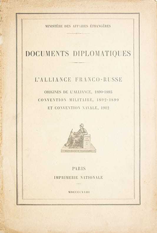 Important recueil officiel publié par le ministère des Affaires étrangères, rassemblant les principaux textes diplomatiques relatifs à la formation et à lévolution de lalliance franco-russe : correspondances initiales, négociations ayant conduit à la convention militaire de 1892 et à sa mise en uvre jusquen 1899, ainsi que la convention navale de 1912. Document capital pour lhistoire diplomatique de la fin du XIXe et du début du XXe siècle, éclairant les origines de la Triple Entente.Première de couverture détachée.