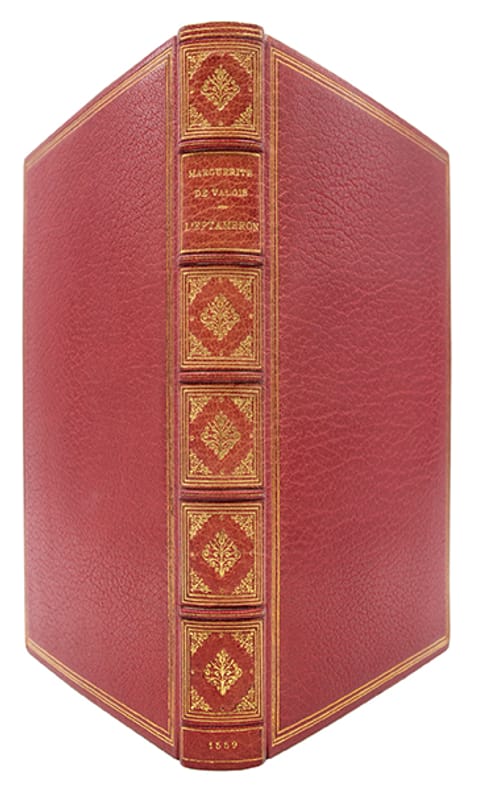 Unique exemplaire connu à ladresse de "Gilles Gilles" de la seconde édition de L'Heptaméron', en partie originale, et première à paraître sous ce titre.Parue en 1559, cette édition marque une étape décisive dans la transmission de loeuvre de Marguerite de Navarre. Elle est la première à restituer lordre chronologique initial des huit journées et à réunir lensemble des 72 nouvelles. Destinée à servir de modèle aux rééditions ultérieures, elle assura la renommée durable de louvrage.Un an auparavant, Pierre Boaistuau avait donné une première version anonyme, sous le titre 'Histoire des amants fortunés', qui ne comprenait que le prologue et 67 nouvelles.La page de titre, datée de 1559, est ornée dun large encadrement "Renaissance" gravé sur bois : satyres, masques, deux cariatides de profil (faune et bacchante), volutes et motifs végétaux. On la retrouve, la même année, dans lédition donnée à ladresse de Benoist Prevost. Lensemble du volume, imprimé par ce dernier, se distingue par lélégance de son matériel typographique et de ses ornements. Parmi les feuillets liminaires figure le célèbre sonnet "Des deux Marguerites" de Jean Passerat.Le présent exemplaire, portant ladresse de "Gilles Gilles" au titre, semble unique : tous les autres exemplaires connus de ce millésime portent les adresses de Robinot, Sertenas, Prevost ou Caveiller. Le privilège royal, daté du 7 avril 1559 et accordé pour dix ans, désigne explicitement Gilles Gilles comme lartisan exclusif de cette entreprise éditoriale. Le texte précise quil a "avec grand fraiz, peine et labeur recouvré et faict rediger par ordre les comptes et nouvelles () et en plus bel ordre et disposition que faict et observé na esté en la première impression dudict oeuvre". Ce privilège est reproduit dans les autres éditions partagées de 1559-1560.Marguerite de Navarre, soeur de François Ier, entreprit dès 1542 la rédaction dun "Décaméron" à la manière de Boccace. Elle ne parvint quà composer huit journées, et loeuvre demeura inachevée. Si la paternité de L''Heptaméron' fut un temps discutée, son authenticité et son attribution à la reine de Navarre ne font désormais plus débat. (Cette édition à ladresse de "Gilles Gilles", 1559 nest pas recensée. Elle manque à lensemble des bibliographies et bibliothèques dans le monde. Pour les éditions de 1559 à dautres adresses, cf. Brunet, III, 1416. Diesbach-Soultrait, 'XVIe', n° 197. Picot, Rothschild, II, 1697. 'En Français dans le texte', n° 56. Tchemerzine-Scheler, IV, 377).Quelques pâles annotations manuscrites marginales du XVIe siècle.Exemplaire soigneusement lavé et parfaitement relié par Semet et Plumelle. Un peu court de marge supérieure, sans atteinte au texte. Quelques minimes restaurations de papier, habiles et dispersées.Très bel exemplaire.