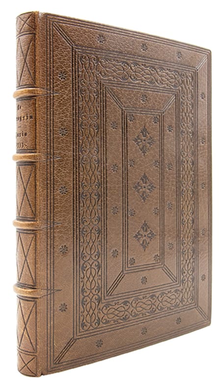 Petit in-4° (195 x 132 mm), maroquin taupe sur ais de bois orné d'un riche décor Renaissance estampé à froid, dos à 4 nerfs prolongés, orné de compartiments garnis d'un motif de filets en croisillon, plats entièrement revêtus dun décor estampé de trois encadrements délimités de triples filets gras, alternant fleurons et entrelacs, réservant un cartouche central, coiffes ciselées, roulettes sur les coupes et les chasses, pièce de titre au noir, tranches dorées sur marbrures (reliure néo-Renaissance signée de Gruel), (6), CCxxiiii (i.e. 214) feuillets, tous inscrits dans une double roulette de motifs d'entrelacs, vrilles de vigne et fleurettes, page de titre imprimée en rouge et noir, lettrines, deux bois d'illustrations gravés dans le texte. On les vend a Paris / en la rue neufve nostre dame / a lenseigne de sainct Jehan baptiste / pres saincte Geneviesve des ardans par Denys Janot. 5 juillet 1535.
