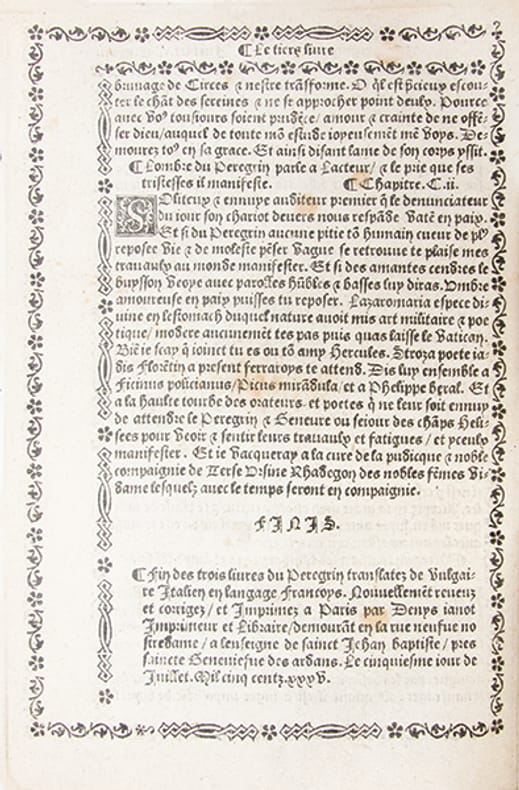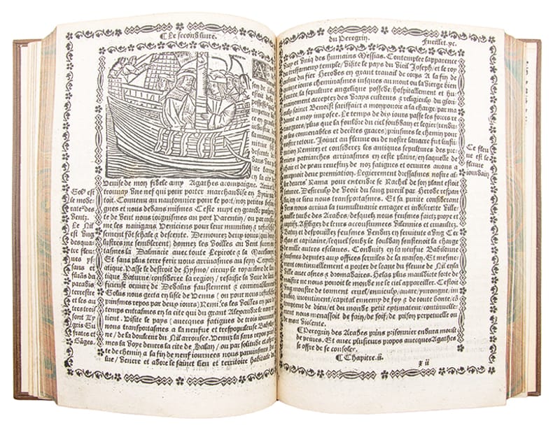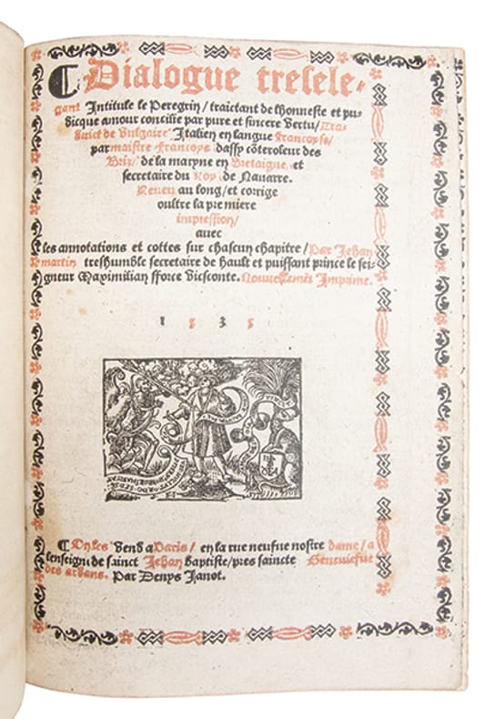 Belle édition parisienne de la traduction française du 'Libro del Peregrino', la dernière à avoir été imprimée en caractères gothiques. Le texte est élégamment encadré dune double roulette ornée de motifs dentrelacs, de vrilles de vigne et de fleurettes. Il est illustré de deux bois gravés dans le texte, inspirés de l'Énéide' (f. 89v et 141r), ainsi que dune page de titre en rouge et noir portant la marque typographique de Denys Janot (Renouard, n° 478), imprimeur du Roi et figure majeure de lédition vernaculaire illustrée au début du XVIe siècle.Louvrage, composé par Jacopo Caviceo (1443-1511), est ici traduit par François dAssy et accompagné de notes de Jean Martin. Il retrace lhistoire de Pérégrin, jeune homme épris de Genèvre, fille dune famille rivale de Ferrare. Leur amour contrarié pousse le héros à entreprendre un pèlerinage au mont Sinaï. Ce voyage initiatique, jalonné de nombreuses étapes en Méditerranée, reflète les propres errances de lauteur, contraint à lexil entre 1460 et 1469.Dédié à Lucrèce Borgia, ce roman sentimental et allégorique, inspiré de la "Divine Comédie" et de "lÉnéide", connut un grand succès au XVIe siècle en Italie, en France et en Espagne. Reflet des préoccupations culturelles de la cour de Ferrare, il constitue une étape importante dans lhistoire du roman et lun des premiers textes en prose spécialement conçus pour un lectorat féminin (cf. G. Reynier, 'Le roman sentimental avant lAstrée', p. 360 sq.).(Rawles, 'Denis Janot', II, n° 35. Renouard, 'Éditions parisiennes du XVIe', IV, 1230. USTC 34521).Très bel exemplaire, remarquablement conservé, dans une riche reliure Renaissance signée de Gruel.
