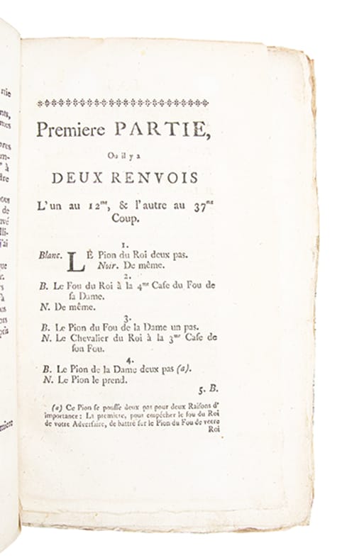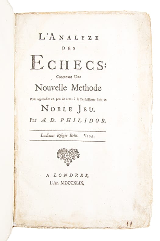 Troisième édition datée de loriginale, ornée dun fleuron de titre aux oiseaux (dit "pecking birds").François-André Danican Philidor (17261795), compositeur renommé issu dune illustre famille de musiciens et meilleur joueur déchecs de son temps, se fit connaître par ses parties simultanées à laveugle.Par cet ouvrage, il donne le traité fondateur de la théorie moderne du jeu : premier à privilégier la stratégie à long terme plutôt que le seul calcul tactique, il analyse la structure des pions, fixe les principes douverture, étudie les finales et commente des parties complètes.Véritable "Discours de la méthode" appliqué aux échecs, illustré de diagrammes, ce livre rompt avec les conceptions antérieures, formalise un système rationnel et établit des principes toujours en usage.Diffusé dans toute lEurope par ses traductions, il exerça une influence décisive et demeura une référence de la littérature échiquéenne.Toutes les impressions de 1749 sont rares ; Hoefer, dans sa "Nouvelle Bibliographie générale" (t. XII, p. 935), déclare nen avoir jamais vu dexemplaire.(Niemeijer, "Chess collection", n° 446).Provenance : "Bonnet Louis le 1er février 1831. Ce livre appartient a moi louis Bonnet fils de Nicolas" (ex-libris manuscrit).Minimes traces de restauration sur la reliure.Très bon exemplaire, bien relié à lépoque.