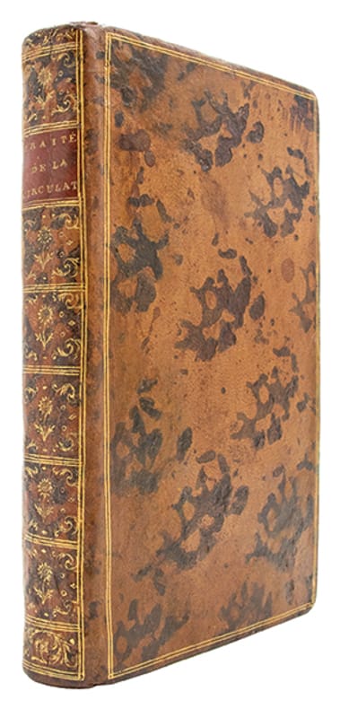 In-8° (197 x 116 mm), veau marbré de l'époque, dos lisse orné de compartiments fleuronnés et cloisonnés, palettes en tête et pied, pièce de titre de maroquin havane, double filet d'encadrement sur les plats, tranches rouges, xvi, 1-128, (8), 129-368 pages, (1) feuillet de "fautes à corriger". Amsterdam, marc-Michel Rey, 1771.