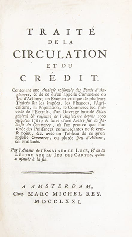 Edition originale de ce traité fondamental, dans lequel Isaac de Pinto (1717-1787), banquier, philosophe et homme daffaires dorigine juive portugaise, développe une conception novatrice du crédit et de la circulation monétaire. À rebours de la méfiance que suscitait alors le crédit, il en souligne le rôle stabilisateur et dynamisant dans les économies modernes.Par son approche empirique et sa défense raisonnée des institutions financières (banques, dettes publiques, marchés boursiers), Pinto soppose à la fois au système de Law et aux vues trop rigides des physiocrates. Il y défend notamment lidée que le crédit nest pas une illusion périlleuse, mais une force décisive du développement économique, capable dassurer la prospérité dun Etat pourvu quil soit rigoureusement encadré.Le 'Traité de la circulation et du crédit' annonce plusieurs principes essentiels de la pensée économique moderne : la circulation comme vecteur de richesse, la confiance comme fondement des institutions financières, le rôle de la dette publique dans la croissance et la fonction structurante des places financières.Sa vision, cosmopolite et pragmatique, résonne fortement dans un siècle qui voit lessor du capitalisme commercial, le début de lendettement des Etats modernes, et les premières spéculations sur les crises systémiques.Loué à lépoque par Voltaire, dAlembert ou Raynal, Pinto fut lun des rares auteurs à conjuguer une connaissance intime des mécanismes bancaires avec une réflexion philosophique et politique sur léconomie. Un jalon essentiel entre la pensée mercantiliste du XVIIe siècle et les théories classiques de Smith et Ricardo.(Einaudi, 4447. Goldsmiths 10791. Higgs, 5282. Kress, 6811. Szajkowski, 'Franco-Judaica', 868).Quelques traces de restauration à la reliure.Bel exemplaire, frais, bien conservé dans sa reliure de l'époque.