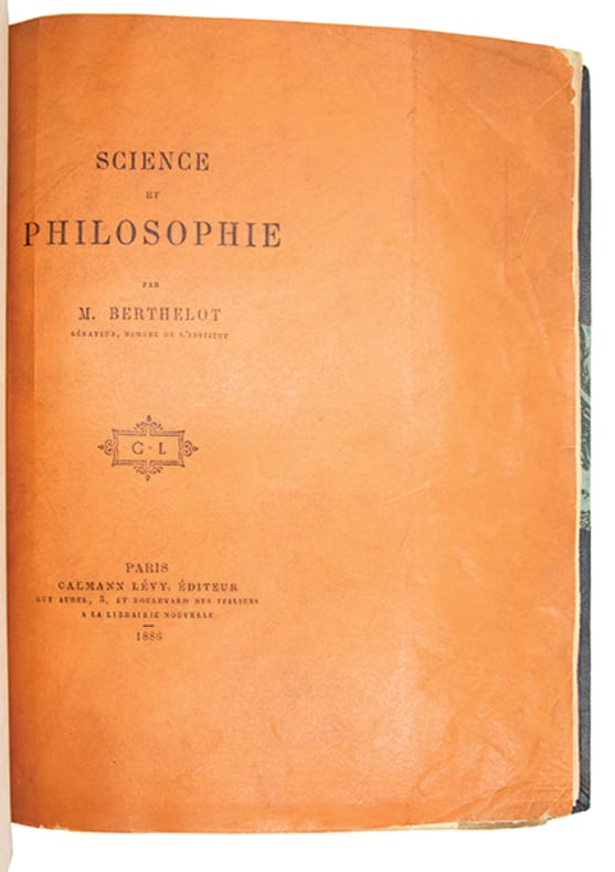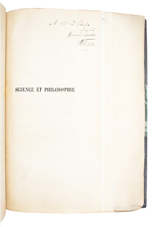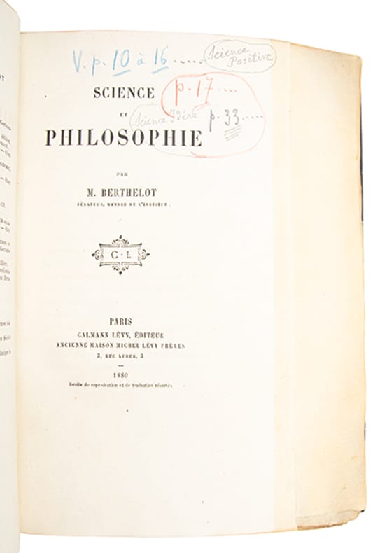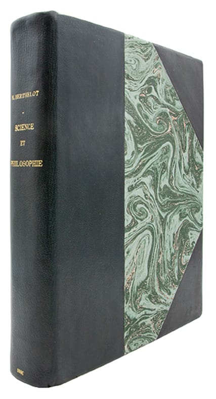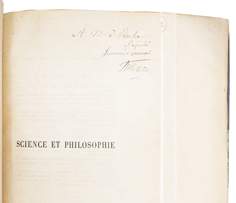 Edition originale sur grand papier, non rogné, témoins de format in-4° conservé, exemplaire dépreuves comportant quelques une envoi autographe de l'auteur au député radical Jules Roche (1841-1923), un proche de Clemenceau.Recueil dessais et de conférences, incluant la lettre adressée à Ernest Renan sur "la science idéale et la science positive". Berthelot y examine la relation entre science expérimentale et philosophie, affirmant lautonomie de la connaissance scientifique et la dimension morale de ses acquis. Il y soutient une conception laïque, rationnelle et humaniste du savoir, inscrite dans le progrès intellectuel et social.L'essai consacre la transition de Berthelot, du savant au théoricien de lépistémologie, et éclaire le dialogue entre science et pensée philosophique sous la IIIe République. (Dict. P.U.F. des philosophes, p. 336).Quelques notes marginales aux crayons de couleurs et à papier.Exceptionnel exemplaire dépreuves avec envoi, très frais, non rogné, couverture et grands témoins conservés.