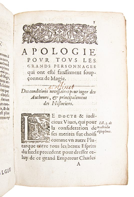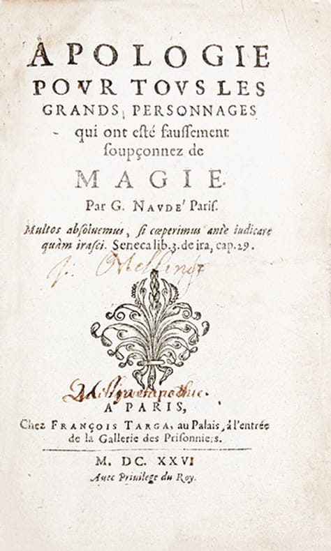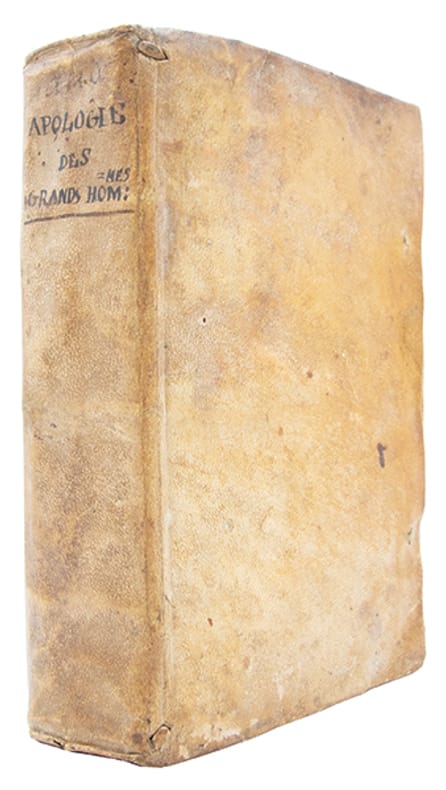 Édition originale rare.Gabriel Naudé (1600-1653), médecin, bibliophile et bibliothécaire du cardinal Mazarin, compte parmi les plus illustres représentants du groupe des "libertins érudits".Publiée en 1625, l'Apologie' paraît dans un contexte troublé, marqué par les procès de Théophile de Viau, de la maréchale dAncre et dUrbain Grandier. Naudé y entreprend de défendre les savants et philosophes injustement accusés de magie. En convoquant des figures telles que Pythagore, Roger Bacon ou Pic de la Mirandole, il démontre combien linnovation intellectuelle fut souvent, par ignorance et crédulité, assimilée à des pratiques diaboliques.Considérée comme un manifeste de tolérance intellectuelle, l'Apologie' illustre lattitude critique des libertins érudits, soucieux de distinguer savoir et superstition, et de défendre la liberté de recherche. Elle occupe une place majeure dans lhistoire de la lutte contre lobscurantisme et annonce, par son esprit rationaliste, les combats scientifiques et philosophiques des Lumières. "Ce livre est une première manifestation de lesprit critique en des choses où il ny en avait pas" (Henri Busson, 'De Charron à Pascal', p. 367)."Des accents comme ceux que trouve Naudé pour condamner le manque desprit critique, pour préconiser une vérification méthodique des faits et dires, surtout à légard dun prétendu surnaturel, on en percevait rarement de son temps ; on nen percevra plus guère avant Bayle et Fontenelle, que l'Apologie' annonce à plus dun titre" (Pintard, 'Le libertinage érudit', p. 449). (Caillet, 7923. Duveen, 423. Guaita, 753. Yve-Plessis, 'Sorcelerie', 1647).Ex-libris manuscrit répété de "Gabriel Mellinet". On trouve un Gabriel Mellinet (1651-1714), apothicaire à Nantes et ancêtre du général Anne François Mellinet (1768-1852).Feuillets brunis.Bon exemplaire