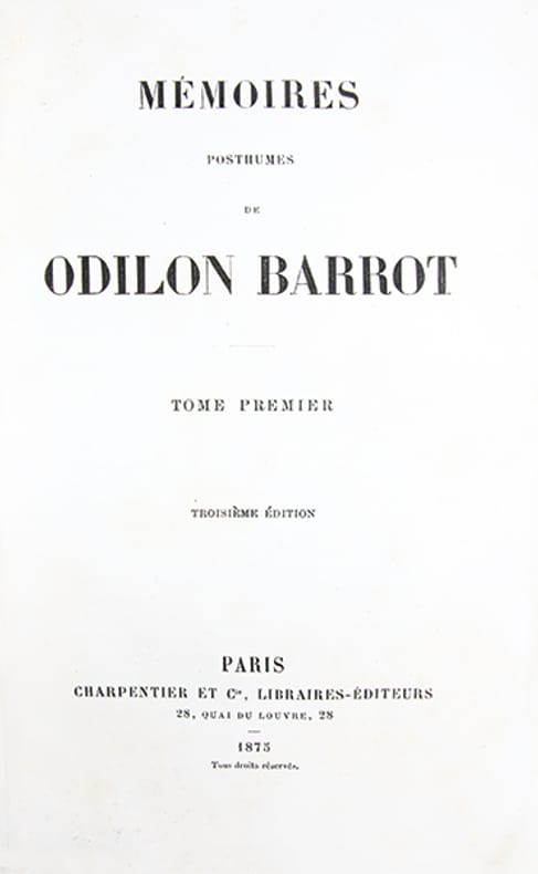 Edition originale. Publiés par un ami et proche collaborateur de l'auteur, Prosper Duvergier de Hauranne, ces Mémoires constituent un témoignage de tout premier plan sur lhistoire politique française du XIXe siècle. Odilon Barrot (1791-1873), chef de file de lopposition dynastique, y retrace avec précision, clarté et indépendance la Restauration et ses luttes parlementaires, lévolution de la gauche dynastique sous la Monarchie de Juillet, la Seconde République et lélaboration de la Constitution de 1848, son passage à la présidence du Conseil en 1849 sous la présidence de Louis-Napoléon Bonaparte, ainsi que la crise opposant le prince-président au parti de lOrdre, jusquau coup dÉtat du 2 décembre 1851. Mention fictive de "Troisième édition" au premier volume et de "seconde édition" aux deuxième et troisième volumes.(Bertier de Sauvigny, n° 71).Provenance: le château dEsternay, résidence de la famille de La Rochelambert, avec petit cachet ex-libris.Plat supérieur du second volume restauré en coin.Bel exemplaire, grand de marges, très frais.