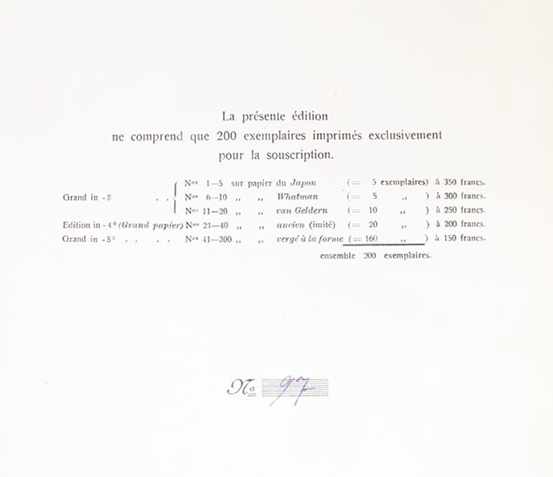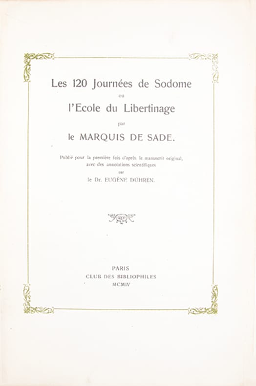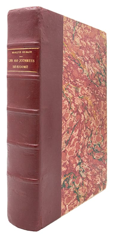 Edition originale publiée en 1904 à Berlin par Max Harrwitz. Un des 160 exemplaires imprimés sur vergé à la forme (justifié n°97) sur un tirage total de 200 exemplaires.La traduction et les notes sont loeuvre du docteur Iwan Bloch (1872-1922), biographe de Sade, dissimulé sous le pseudonyme dEugène Dühren. Médecin, sexologue et psychiatre allemand, Bloch avait acquis le célèbre manuscrit rédigé par Sade en 1785 à la Bastille. Cet extraordinaire manuscrit, composé de 33 feuillets collés bout à bout pour former un rouleau de 12,10 mètres de long sur 11,3 cm de large, écrit au recto et au verso, est aujourd'hui conservé à la Bibliothèque nationale de France (BnF). "S'il y a un enfer dans les bibliothèques, c'est pour un tel livre. On peut admettre que, dans aucune littérature d'aucun temps, il n'y a eu un ouvrage aussi scandaleux, que nul autre n'a blessé aussi profondément les sentiments et les pensées des hommes" (Maurice Blanchot).(Dutel, 131. 'Eros invaincu', n° 47. Pia, 'Livres de l'Enfer', 1998, col. 187-189).Quelques minimes épidermures au dos.Très bon exemplaire, très frais, non rogné, témoins conservés.