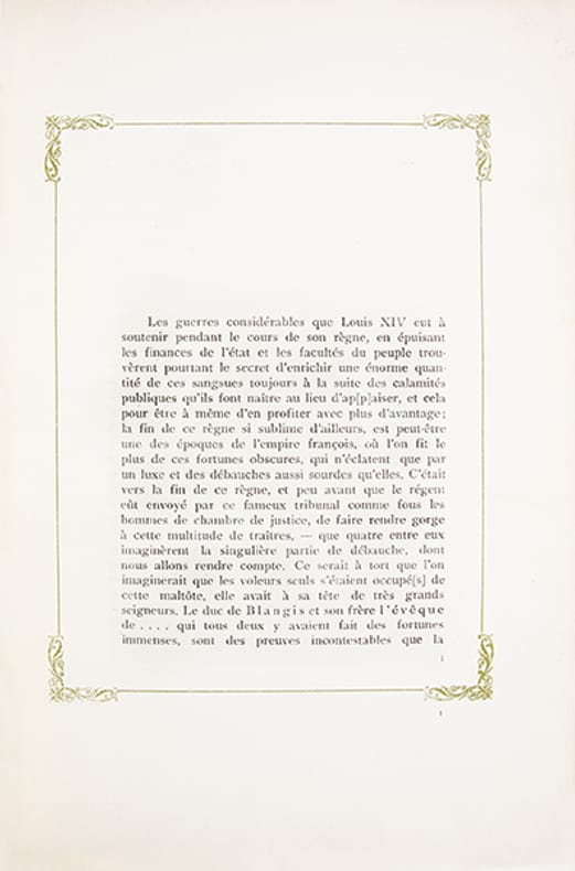 Grand in-8° (267 x 177 mm), demi-veau rouge de l'époque, dos à 5 nerfs plats, pièce de titre de veau, (8), 543, (1) p., texte encadré d'un filet vert bronze orné d'un motif rocaille en écoinçon, exemplaire non rogné. Paris, Club des bibliophiles [i.e. Berlin, Max Harrwitz], 1904.