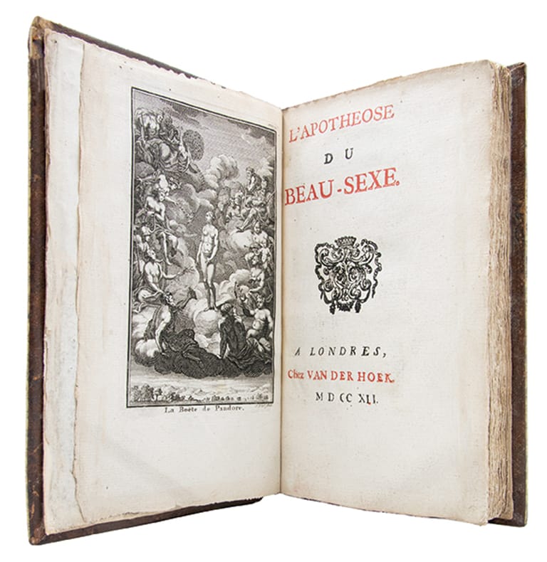 Edition originale et unique de l'une des spéculations libertines les plus hardies de la période: le sexe ici est à prendre à son sens littéral de "parties génitales de la femme". "L'auteur se propose de vouer un culte religieux aux organes sexuels féminins et justifie la légitimité de ce choix et l'opportunité d'un retour au paganisme naturel. 'L'apothéose' du sexe féminin est réclamée au nom de la Raison (p.64). Le plaisir sexuel est "le seul des plaisirs parfaits, parce qu'il occupe à la fois & les parties du corps et les facultés de l'Âme" (p.128) (). En conclusion, il convient de "regarder ces Parties comme quelque chose de très vénérable et de très aimable en même temps" (p.85). Quant aux "sacrifices" que l'auteur se propose d'offrir à ces divinités, on devine quels ils sont. C'est au lieu même de ces sacrifices, conformes à la raison naturelle, que la supériorité de la femme [dont l'endurance sexuelle est l'un des atouts] peut enfin être sans conteste établie" (cf. longue analyse in M. Angenot, 'Les champions des femmes', PU du Québec, 1977, p. 75-77). L'attribution par Brunet à A.-F. Boureau Deslandes n'est pas retenue par Jean Macary, le biographe de cet auteur.Le lieu de publication est fictif, il s'agit sans doute d'Amsterdam. La date, imparfaitement imprimée sur la page de titre, pourrait laisser croire qu'il s'agit de 1712, erreur souvent reprise; il s'agit bien de 1741. Le frontispice intitulé "La boëte à Pandore" est l'oeuvre du graveur et marchand d'art amstellodamois Pieter Yver (1712-1787).(Gay I, 258).Coupes frottées. Rares rousseurs.Bon exemplaire, couverture en papier dominoté de l'époque conservée.