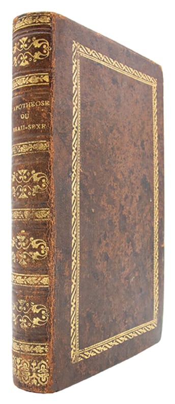 1712 Couverture rigide Londres, chez Van der Hoek, 1712 [1741]. In-12, reliure demi-maroquin à longs grains, à coins, dos à nerfs orné de caissons à motifs dorés, filets dorés d'encadrement sur les plats, dos insolé. Fronstispice, XLVI, 138 pages, 34 pages non chiffrées de tables, impression en gros caractères. Le frontispice "La boëte de Pandore" fut réalisé par le graveur Pieter Yver. Frontispice que l'on retrouve en 1777 dans "l'essai sur le caractère des femmes" par Thomas, et dessiné par Cochin (Cohen, 85). La date d'édition ainsi que le lieu sont apparemment faux. L'année d'édition à retenir est 1741, et Amsterdam est probablement le lieu d'impression. Ouvrage anonyme, parfois attribué à Deslandes, dans lequel son auteur rend ici un hommage appuyé (et totalement transgressif pour l'époque) aux vertus du sexe féminin. Bon exemplaire de cette édition originale, en très bon état.