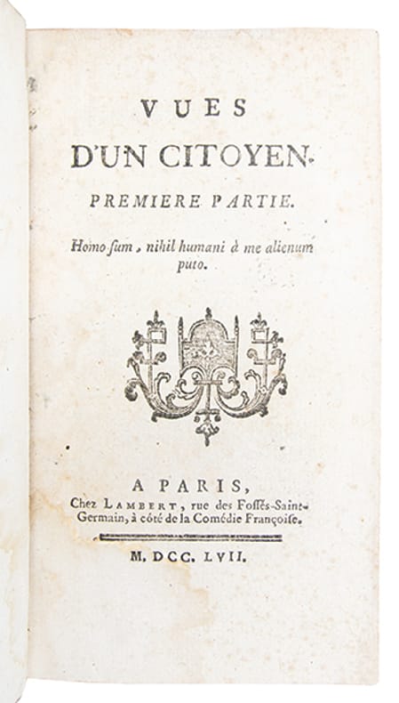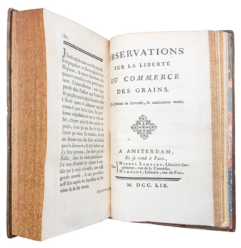 Première édition collective dans laquelle Chamousset réunit sept mémoires dabord publiés séparément : "Plan d'une maison d'association", "Additions et éclaircissemens", "Lettre critique à l'auteur d'une brochure intitulée : Plan d'une maison et réponse de Chamousset", "Exposition d'un plan proposé pour les malades de l'Hôtel-Dieu", "Mémoire politique sur les enfans", "Sur les revenus de l'hôpital S. Jacques", "Plan général pour l'administration des hôpitaux du royaume & pour le bannissement de la mendicité".Magistrat à la Cour des Comptes, médecin de formation et philanthrope, Claude-Humbert Piarron de Chamousset (1717-1773) est cité parmi les précurseurs de la sécurité sociale et des systèmes assuranciels de santé. Admiré de Voltaire et de Rousseau, il consacra sa fortune à la réforme des hôpitaux et de lassistance publique. Il transforma sa maison en hôpital, offrant gratuitement soins et indemnité compensant le temps perdu. Il fut aussi linitiateur des associations de secours mutuels, où chaque travailleur, moyennant une modeste cotisation hebdomadaire, pouvait sassurer un traitement médical.Dans ce recueil, Chamousset expose également des projets touchant à la mendicité, à la protection de lenfance et à ladministration des hôpitaux, qui savéreront prophétiques. Louvrage sinscrit dans un vaste mouvement de réformes sociales et sanitaires au XVIIIe siècle, auquel il apporte une contribution majeure. Chamousset est aussi linventeur de la « Petite poste » parisienne, service de courrier local à tarif réduit, qui suscita un vif débat.(Goldsmiths, Online Catalogue, n° 9272.8-1 suppl. INED, 3575)Relié avec : [PIARRON DE CHAMOUSSET (Claude-Humbert) ou HERBERT (Claude-Jacques)], Observations sur le commerce des grains, Amsterdam, chez Michel Lambert et Humblot [i.e. France], 1759. (4), 60 p. Chamousset selon Musset ('Bibliographie agronomique', 1810, n° 1448) ou Herbert selon Barbier. Ladresse dAmsterdam est fictive ; limpression est vraisemblablement parisienne (permission tacite accordée en 1759 à Jacques Chardon, Cat. BnF, ms. fr. 21994, n° 926). Lauteur soutient que la libre circulation des céréales favorise léquilibre des approvisionnements et que la réglementation des prix, en perturbant le marché, accentue les crises, anticipant ou rejoignant les conceptions physiocratiques de léconomie (cf. G. Weulersse, 'Mouvement physiocratique', p. XXIII). AVIS SUR LE COMMERCE DES GRAINS & de toutes autres denrées quon peut transporter par les rivières dAîne, dOise & de Seine, S.l.n.d. [1764], 16 p. Projet destiné à favoriser la liberté du commerce et de la circulation des grains et dautres marchandises par la création dune compagnie de transport fluvial. (Goldsmiths-Kress, n°9974. Higgs, n°3163). MÉMOIRE SUR LE TIRAGE DE BATEAUX PAR LES BUFS, s.l.n.d. [1764]. 28 p. Suite du projet précédent, proposant de remplacer les chevaux des chemins de halage par des bufs ; le montage de la compagnie y est détaillé et chiffré, et lorganisation juridique présentée en articles conclusifs. PROSPECTUS DE LETABLISSEMENT DUNE MAISON DASSOCIATION, en faveur des Filles de Boutique, Ouvriers & Domestiques. [Paris], Imprimerie de Grange, 1762. 8 p.Projet destiné à offrir abri et soins aux femmes les plus exposées de la société, dabord publié dans le Mercure de France (mai 1762) et resté sans suite.Epidermure au plat supérieur, auréole en marge inférieure des trois premiers feuillets, quelques rousseurs éparses ; p. 121-126 de la seconde partie brunies. Bon exemplaire.