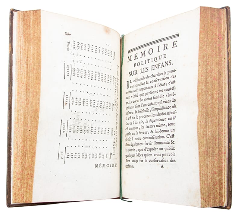 "FAC-SIMILE tiré à 250 exemplaires numérotés sur papier vergé plus 30 hors-commerce (celui-ci non justifié). Première partie: ""Plan d'une Maison d'association dans laquelle au moyen d'une somme très modique chaque associé s'assurera dans l'état de maladie toutes les sortes de secours qu'on peut désirer"". Deuxième partie: ""Deux mémoires : Le Premier, Sur la conservation des enfans, et une destination avantageuse des enfans trouvés. Le Second : Sur les Biens de l'hôpital S. Jacques, leur état actuel et leur véritable destination."" Traces d'usure à une coiffe, un coin du dos abimé.. Bon exemplaire."