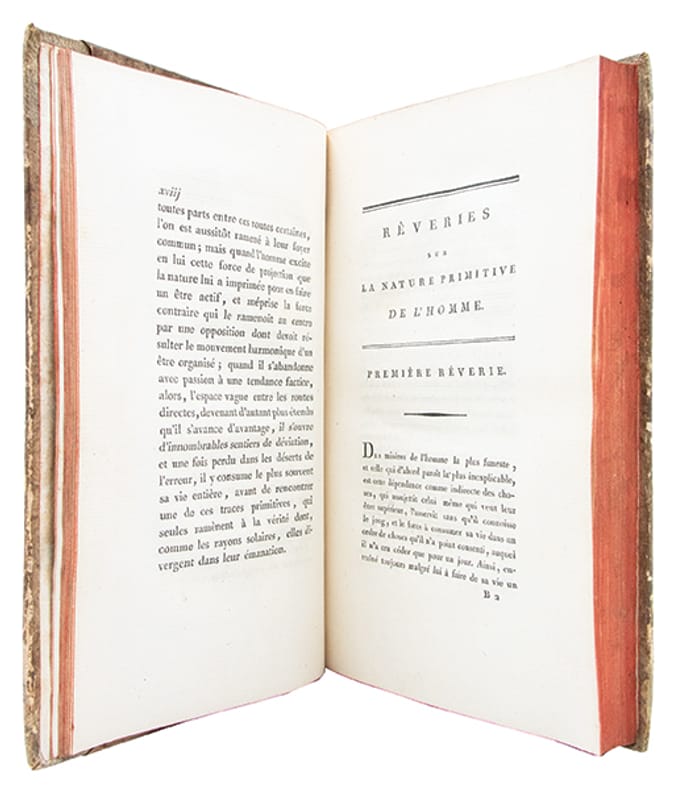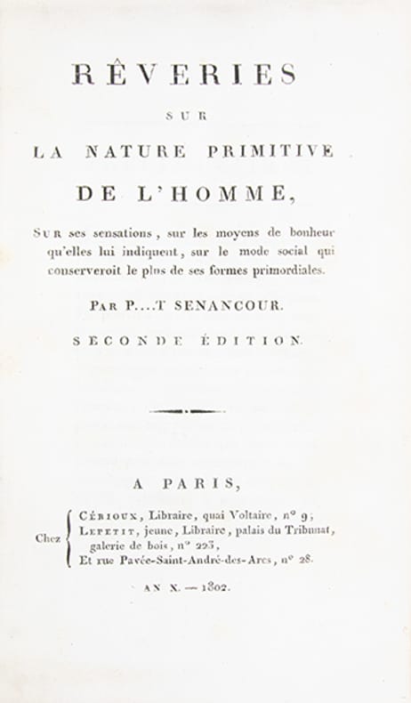 Edition originale dans sa version complète de cette uvre majeure de Senancour, remise en vente sous une nouvelle page de titre portant la mention factice de "seconde édition".Un premier fragment, comprenant deux "rêveries", avait paru en mars-avril 1798 ; le texte fut ensuite complété et fixé, ici, dans sa forme définitive.Inspiré par Rousseau, auquel il rend un hommage explicite par la forme méditative et par une réflexion morale et anthropologique novatrice, ce texte compte parmi les fondations du romantisme français.Dabord accueilli dans une relative indifférence, il ne connut une reconnaissance durable quau XIXe siècle, notamment grâce à ladmiration de George Sand et de la génération romantique.Dans la préface à la troisième édition de 1833, Senancour éclaire les circonstances singulières de cette publication: "la première [édition] ayant été enfouie dans les magasins d'un spéculateur étranger à la librairie, le libraire, entre les mains de qui tombèrent ces ballots trois ans plus tard, imagina de changer la page de titre des 'Rêveries' et d'y mettre le mot de 'seconde édition' ".Références: J. Levallois, 'Senancour', p. 201 ; J. Merlan, 'Bibliographie des uvres de Senancour', p. 9 ; Clouzot, p. 251, qualifie cette édition originale de "très rare".Très bel exemplaire, très frais, très grand de marges, imprimé sur beau papier vergé de Hollande, bien relié à lépoque.