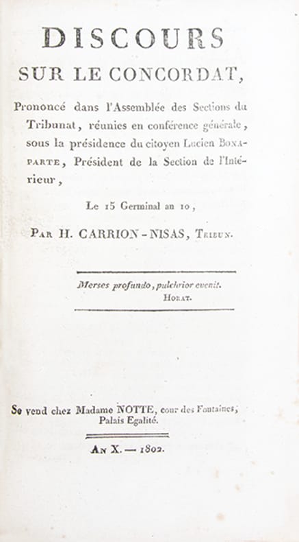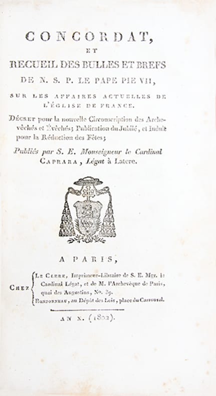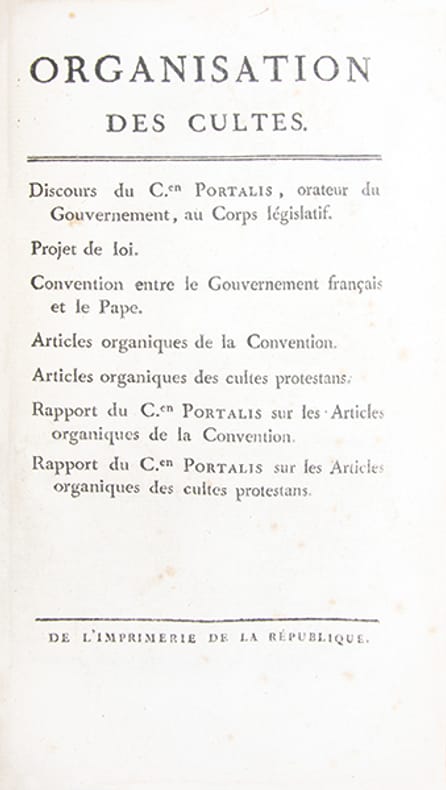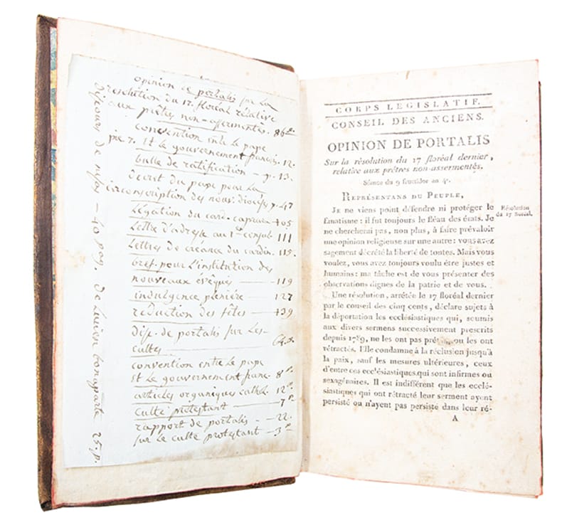 Important recueil de brochures en édition originale, reliées à l'époque, relatives à la réorganisation des cultes sous le Consulat et lEmpire, rassemblant plusieurs textes fondateurs. On y trouve notamment "l'Opinion de Portalis sur la résolution du 17 floréal an IV" (1796), où saffirme déjà son rôle dartisan de la pacification religieuse, et surtout son grand "Discours sur lorganisation des cultes" (germinal an X, 1802), texte-clef du Concordat. Lensemble comprend également lédition originale du recueil publié par le cardinal Caprara, légat du pape et signataire du Concordat, les conventions officielles entre le gouvernement et Pie VII, ainsi que les Articles organiques du culte catholique et des cultes protestants, assortis des rapports explicatifs de Portalis. Enfin, les discours prononcés par Siméon, Lucien Bonaparte et Carrion-Nisas témoignent du débat parlementaire autour de la reconnaissance et du contrôle des cultes. Ces pièces capitales permettent de saisir, au plus près des sources, la construction du système concordataire qui, en réconciliant Église et État, institua un modèle durable des relations entre le pouvoir civil et les religions en France.Piqûres et rousseurs plus prononcées sur quelques feuillets. Une table manuscrite à l'époque sur papier bleuté est jointe au volume. Quelques traces de restaurations anciennes à la reliure.Bon exemplaire, relié à l'époque.