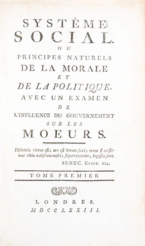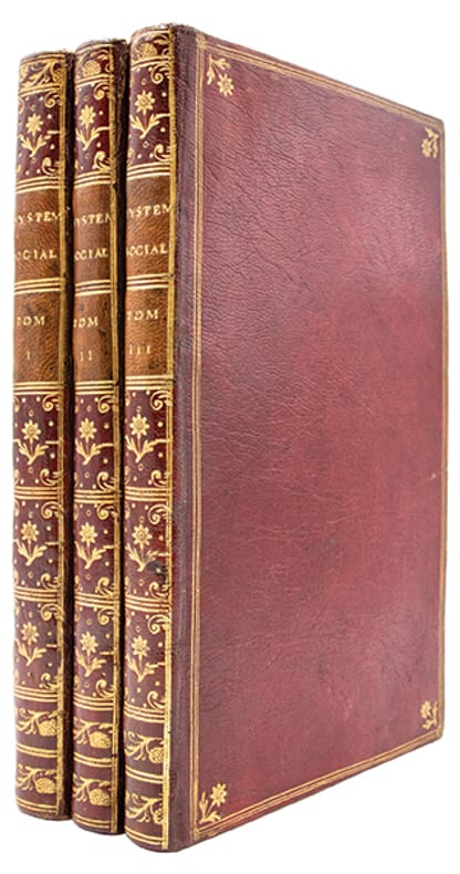 The rare first edition, first issue (though Tchermerzine mentions an unknown 2-volume-edition form the same year - this edition has never been verified), of one of d'Holbach's most important works, his influential ""social"" and political continuation of his seminal main work ""Systeme de la nature"" - the bible of materialism. D'Holbach (1723-1789), who was raised by a wealthy uncle, whom he inherited, together with his title of Baron, in 1753, maintained one of the most famous salons in Paris. This salon became the social and intellectual centre for the Encyclopédie, which was edited by Diderot and d'Alembert, whom he became closely connected with. D'Holbach himself also contributed decisively to the Encyclopédie, with at least 400 signed contributions, and probably as many unsigned, between 1752 and 1765. The ""Côterie holbachique"" or ""the café of Europe"", as the salon was known, attracted the most brilliant scientists, philosophers, writers and artists of the time (e.g. Diderot, d'Alembert, Helvetius, Voltaire, Hume, Sterne etc, etc.), and it became one of the most important gathering-places for the exchange of philosophical, scientific and political views under the ""ancient régime"". Apart from developing several foundational theories of seminal scientific and philosophical value, D'Holbach became known as one of the most skilled propagators and popularizers of scientific and philosophical ideas, promoting scientific progress and spreading philosophical ideas in a new and highly effective manner. D'Holbach was himself the most audacious philosophe of this circle. During the 1760's he caused numerous anticlerical tracts (written in large, but not entirely, by himself) to be clandestinely printed abroad and illegally circulated in France. His philosophical masterpiece, the ""Système de la nature, ou des lois du monde physique et du monde moral"", a methodological and intransigent affirmation of materialism and atheism, appeared anonymously in 1770"" (D.S.B. VI:468), as did the social and political follow-up of it, the famous ""Systême social"" in 1773. That is to say, Mirabeau whom he had used as the author on the ""System of Nature"" in 1770 is not mentioned in the ""Social System"", on the title-page of which is merely stated ""By the Author of ""Systême de la Nature"". As the theories of d'Holbach's two systematic works were at least as anticlerical and unaccepted as those of his smaller tracts, and on top of that so well presented and so convincing, it would have been dangerous for him to print any of them under his own name, and even under the name of the city or printer. Thus, ""Systême de la Nature"" appeared pseudonomously under the name of the secretary of the Académie Francaise, J.B. Mirabaud, who had died 10 years earlier, and under a fictive place of printing, namely London instead of Amsterdam. ""He could not publish safely under his own name, but had the ingenious idea of using the names of recently dead French authors. Thus, in 1770, his most famous book, ""The System of Nature"", appeared under the name Jean-Baptiste Mirabaud."" (PMM 215), and so the next ""System"" also appeared in the same manner three years later.In his ""Systême de la Nature"", d'Holbach had presented philosophical materialism in an actual system for the first time and had created a work that dared unite the essence of all the essential material of the English and French Enlightenment and incorporate it into a closed materialistic system"" on the basis of a completely materialistic and atheistic foundation, he provided the modern world with a moral and ethic philosophy, the effects of which were tremendous. It is this materialism and atheism that he continues three years later in his next systematic work ""Systême social"", through which politics, morality, and sociology are also incorporated into his system and take the place of the Christianity that he had so fiercely attacked earlier on. In this great work he extends his ethical views to the state and continues the description of human interest from ""Systême de la Nature"" by developing a notion of the just state (by d'Holbach calle ""ethocracy"") that is to secure general welfare. ""Système social (1773"" ""Social System"") placed morality and politics in a utilitarian framework wherein duty became prudent self-interest."" (Encyclopaedia Brittanica). ""Holbach's foundational view is that the most valuable thing a person seeking self-preservation can do is to unite with another person: ""Man is of all beings the most necessary to man"" (Sysème social, 76"" cf. Spinoza's Ethics IVP35C1, C2, and S). Society, when it is just, unites for the common purpose of preservation and the securing of welfare, and society contracts with government for this purpose."" (SEP).As the ""Systême de la Nature"" had been condemned to burning in the year of its publication, so the ""Systême social"" was on the list of books to be confiscated already in 1773, and it was placed on the Index of the Church in August 1775. As the ""Systême de la Nature"", the ""Systême social"" is thus also of great scarcity. Another edition of the work appeared later the same year, in 12mo. Tchermerzine says that ""Il ya une édition, que nous ne connaissons pas, en 2 vol. in-8. C'est sans doute l'originale."" The present edition was reprinted the following year, in 1774.Tschermerzine VI:246" Graesse III:317 Barbier IV:622 (only listing later editions).