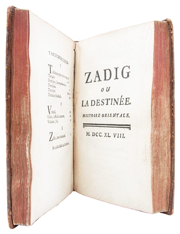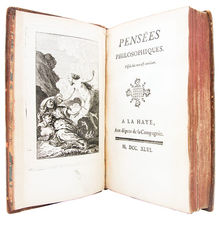 1- Première édition sous ce titre, en partie originale, du conte philosophique le plus célèbre de Voltaire avec 'Candide'. Paru dabord en 1747 sous le titre 'Memnon', louvrage est ici considérablement remanié et enrichi dune épître dédicatoire à la marquise de Pompadour, de trois chapitres inédits, "Le Souper", "Le Rendez-vous" et "Le Pêcheur", ainsi que de variantes dans quatre autres chapitres.Voltaire fait précéder le conte dune approbation de fantaisie, parodie facétieuse des approbations de Crébillon, qui avait censuré plusieurs de ses pièces. Afin de prévenir les contrefaçons, il fit imprimer louvrage simultanément à Paris et à Nancy.(Bengesco, n° 1421 ; Voltaire à la BnF, II, n° 2975).2- Edition originale, imprimée sur papier fort. Premier tirage selon Tchemerzine-Scheler et Niklaus ou troisième tirage selon Adams. Planche gravée en frontispice: "La vérité arrache le masque à la superstition"."Le premier pas philosophique de Diderot". Dans ce volume qui fit scandale, Diderot sattache, par aphorismes, à explorer les voies dune morale fondée sur la raison, la réhabilitation des passions et la libre pensée, affranchie du joug de la religion."Ce livre mérite d'être considéré, vu les polémiques et les échos qu'il suscita, comme l'un des plus importants du XVIIIe siècle" (Wilson, 'Diderot', p. 47).L'ouvrage fut immédiatement condamné par un arrêt du Parlement de Paris. (Adams, PD3. Selon R. Niklaus, 'Pensées philosophiques', Droz, 1950, P1, p. 50, "premier tirage rare". Tchemerzine-Scheler, II, 919). Très bel exemplaire, grand de marges, très bien relié à l'époque.