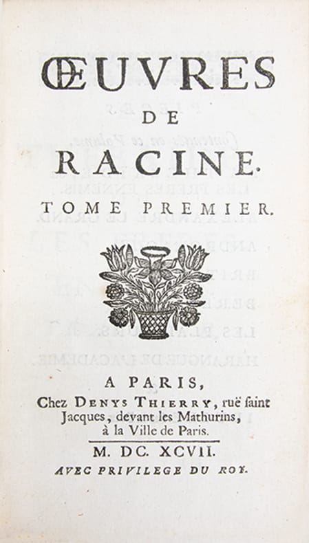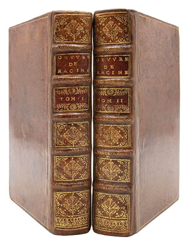 Première édition complète des uvres de Jean Racine, troisième édition collective et dernière publiée du vivant de lauteur, revue, corrigée et augmentée par lui-même. "La première complète. Elle est plus recherchée que celle de 1687" (Guibert).Elle réunit douze pièces, dont "Esther" (1689), "Athalie" (1691) et les "Cantiques spirituels" (1694), absents des précédentes éditions collectives.Publiée conjointement par Claude Barbin, Denys Thierry et Pierre Trabouillet, elle est illustrée dun frontispice daprès Charles Le Brun au tome I, et au tome II, dun frontispice non signé portant en médaillon "uvres de Jean Racine", de 10 figures dessinées et gravées par François Chauveau ainsi que de 2 figures non signées pour "Esther" et "Athalie" Selon Jules Le Petit ('Éditions originales françaises', p. 384): "Cette excellente édition est la dernière que Racine ait donnée, et elle a fixé le texte de toutes les éditions postérieures. Cest aussi la première qui soit complète."(Cohen-de Ricci, 1077. Guibert, "Bibliogr. des uvres de Racine", p. 156-159. Tchemerzine-Scheler, V, p. 360).Très bel exemplaire, très bien relié à l'époque.
