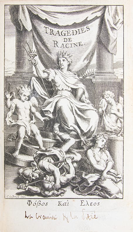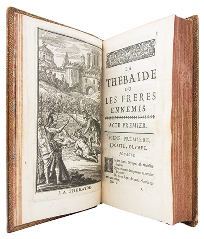 Chez Denys Thierry 10 x 17 Paris 1702 In-12, reliure plein maroquin brun de l'époque, dos à cinq nerfs richement orné de petits fers, titre doré, large dentelle encadrant les plats, dentelle intérieure, tranches dorées. Tome I seul, réglé, orné d'un frontispice gravé d'après C. le Brun par Seb. Le Clerc et de 6 figures, en taille-douce dessinées et gravées par François Chauveau, d'un très bon tirage, 5 ff. y compris le frontispice, 468 pp. Contient : La Thébaïde ou les Frères Ennemis, Alexandre le Grand, Andromaque, Britannicus, Bérénice, Les Plaideurs et in fine "Discours prononcé à l'Académie française à la réception de Mr Corneille et de Bergeret le deuxième janvier 1685" et "Ydille sur la paix". Racine (1639-1699) n'a pu terminer la révision de cette édition à laquelle Boileau aurait participé et qui peut passer pour la dernière des éditions originales des oeuvres de Racine. Elle renferme des variantes intéressantes. le texte des Plaideurs est en grande partie remanié. Ex-libris armorié gravé du grand bibliophile bordelais Philippe-Louis de Bordes de Fortage (1846-1924) sur le premier contreplat. Note manuscrite signée Fortage en date du 18 août 1883 collée au dos de la première garde expliquant l'intérêt de cette édition. La bibliothèque de Bordes de Fortage qui comptait quinze mille volumes fut dispersée en trois vacations de 1924 à 1927. Notice de catalogue collée in fine sur la dernière garde. Coiffe supérieure abîmée, sinon belle reliure finement ornée et bon intérieur. (Bbis6) PHOTOS NUMERIQUES DISPONIBLES PAR EMAIL SUR SIMPLE DEMANDE-DIGITAL PHOTOGRAPS MAY BE AVAILABLE ON REQUEST