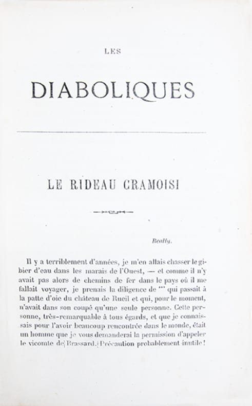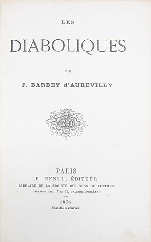 Edition originale de première émission, pour laquelle il na pas été tiré de grand papier.Dès sa parution en novembre 1874, le recueil fut saisi et Barbey poursuivi sous linculpation doutrage à la morale publique et aux bonnes moeurs. La police perquisitionna chez léditeur Dentu, et lauteur, âgé de soixante-six ans et déjà été emprisonné à plusieurs reprises, ne reçut alors aucun soutien. Grâce à lintervention de Gambetta, il obtint toutefois un non-lieu en échange du retrait de louvrage. Il fallut attendre 1882 pour que "Les Diaboliques" soient réédités par Alphonse Lemerre et enfin largement diffusés."Six histoires de femmes qui cultivent leur péché en un recueillement impie, six nouvelles de passion, dadultère et de crime (...). Contre les bien-pensants, Barbey dAurevilly eut laudace de montrer, dans un style aussi luxuriant que cynique, la puissance du désir érotique et ses perversions" (Jean-Pierre Seguin, GF, 2019).(Carteret, I, 110-112: "Fort rare et recherché". Drujon, 'Ouvrages condamnés', p. 124. En Français dans le texte, n°300. Vicaire, I, 305).Provenance: Oscar de Bonnefoy du Charmel (1813-1898) avec son ex-libris armorié et gravé à sa devise (Catalogue de la bibliothèque, Paris, Giraud-Badin, vente du 18 déc. 1944, n°145).Dos légèrement passé. Très bon exemplaire, relié à lépoque, grand de marges, témoins conservés.