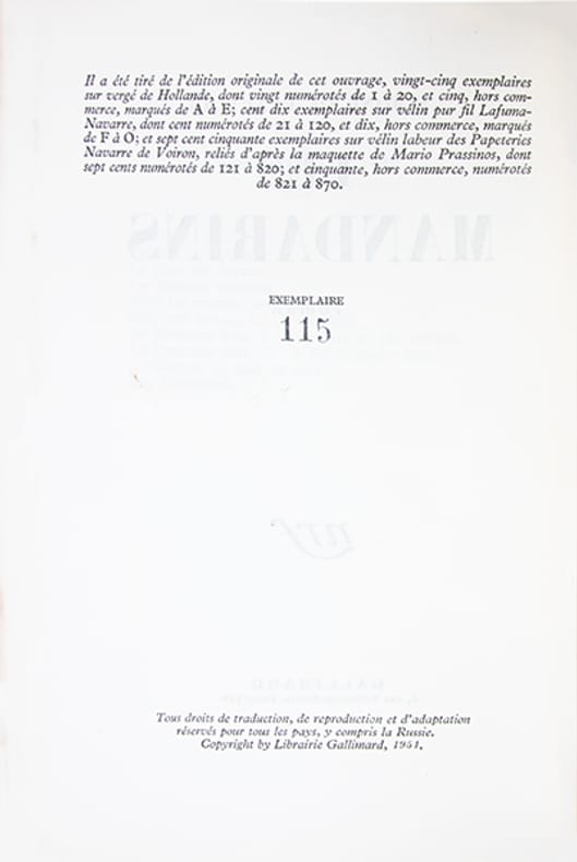 Édition originale, celui-ci sur vélin pur fil Lafuma-Navarre (n° 115), second grand papier après 25 sur vergé de Hollande.Couronné par le prix Goncourt, 'Les Mandarins' met en scène un cercle dintellectuels de gauche dans la France daprès-guerre, déchiré entre fidélité communiste, méfiance stalinienne et attrait américain.Le récit alterne les voix dAnne Dubreuilh et Henri Perron, doubles de Simone de Beauvoir et Albert Camus, confrontés aux dilemmes politiques et moraux post-Libération, tandis que sexplorent les ruptures personnelles, dont la liaison dAnne avec Lewis Brogan, transposition de Nelson Algren avec lequel l'autrice avait entretenu une relation amoureuse passionnée.Fortement autobiographique, luvre évoque la brouille Sartre-Camus et questionne le rôle de lintellectuel engagé.L'uvre qui avait été accueillie de façon contrastée a fait lobjet dune réévaluation critique durable, notamment dans le cadre des études féministes.Mors et coins légèrement frottés, dos discrètement insolé.Bon exemplaire, frais et non rogné, témoins conservés.