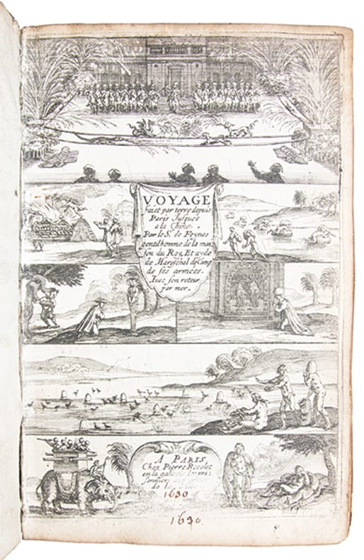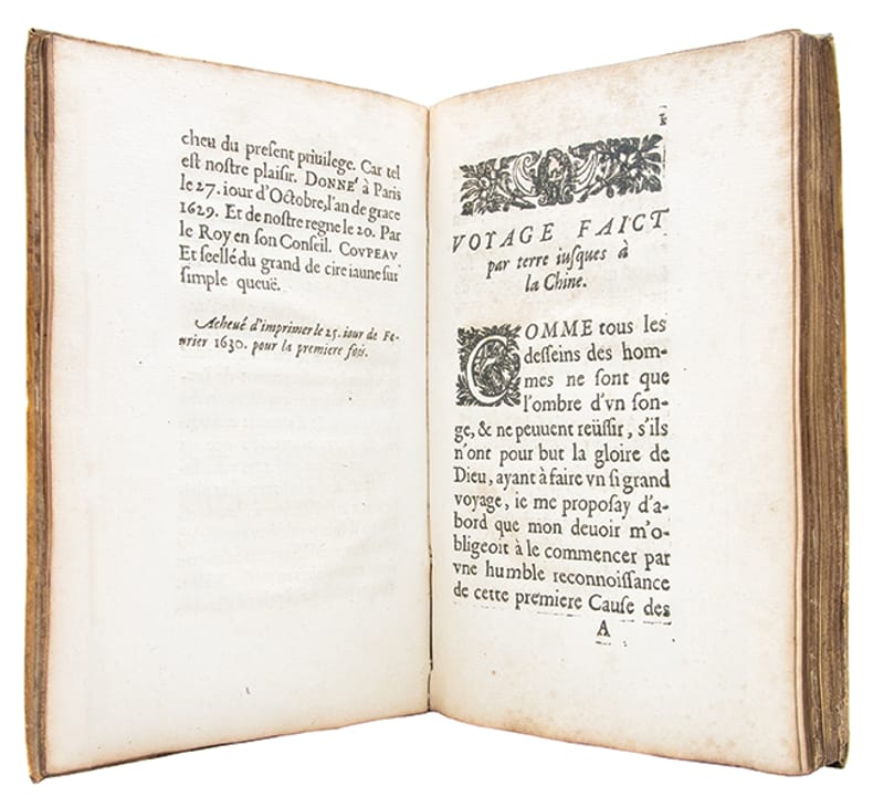 Edition originale de la plus grande rareté, ornée dun remarquable titre-frontispice gravé sur cuivre figurant une allégorie du voyage et des continents.Henri de Feynés (ca 1573-1647), gentilhomme dauphinois de la maison du roi, y relate lun des voyages les plus étendus et les plus précoces accomplis par un Français jusquen Chine."Ce voyage dun gentilhomme de la cour dHenri IV jusquà Canton, entre 1606 et 1609, constitue un événement majeur dans lhistoire des voyages français au XVIIe siècle" (Dirk van der Cruysse).Il quitte la France en 1606; chargé par Henri IV dune mission dinformation officieuse, et voyageant sous le nom de "comte de Monfart", il emprunte un itinéraire exceptionnel passant par Venise, Alep, Bagdad et Ispahan, à la cour de Shah Abbas Ier, puis par Ormuz, lInde et Goa, avant Malacca, les Moluques, Macao et Canton. Il y décrit le commerce de la soie et des porcelaines, observe la pêche pratiquée à laide doiseaux dressés, les cormorans, sétonne des pieds bandés des femmes de qualité et mentionne un breuvage encore inconnu en France, le café, quil nomme "cahayette"; témoignage dautant plus précieux quil faut attendre la fin du XVIIe siècle pour voir dautres Français parvenir jusquen Chine.Le retour seffectue par mer autour du cap de Bonne-Espérance. Arrêté à Lisbonne en 1611, soupçonné despionnage, il y est libéré en 1613 grâce à lintervention du duc de Mayenne.Rédigé entre 1606 et 1608 dans un style précis et résolument laïque, le texte constitue une source de premier ordre sur la Perse safavide, lEmpire moghol sous Jahangir, les établissements portugais dAsie et les premières tentatives françaises de pénétration commerciale en Extrême-Orient.Une traduction anglaise anonyme parut à Londres dès 1615 sous le titre "An Exact and Curious Survey of all the East Indies".(Cordier, 'Bibliotheca Sinica', col. 207. Chadenat, 634. Van der Cruysse, 'Le Noble Désir de courir le monde', 2002, p. 28-30. Lach & Van Kley, 'Asia in the Making of Europe', III, 1, p. 401. Lust, 'Western Books on China', n° 47).Provenance: "J'appartiens à Monsieur de La Leu [à] Avesnes" avec ex-libris manuscrit à l'époque sur la première garde blanche.Quelques taches ocre à la reliure. Quelques rousseurs éparses.Très bon exemplaire, grand de marge, bien conservé dans sa première reliure de vélin doré.