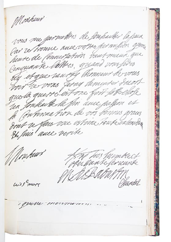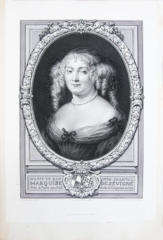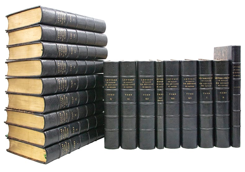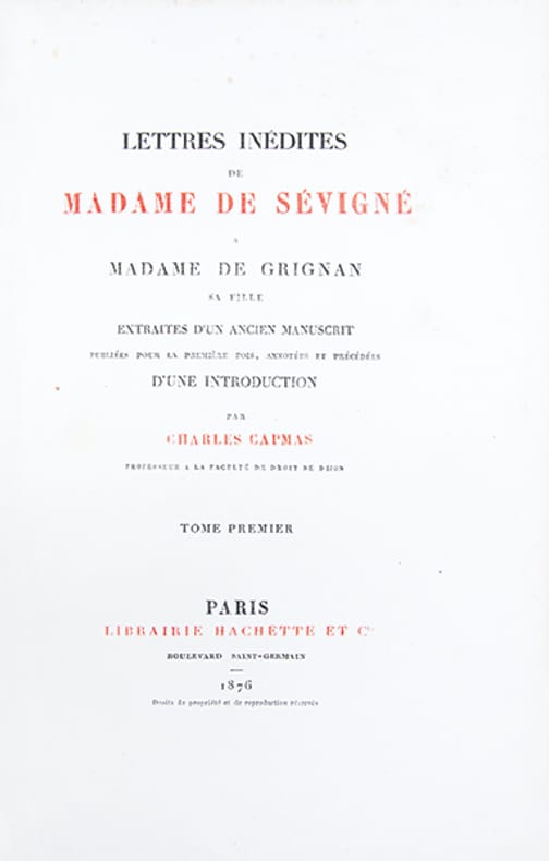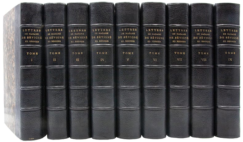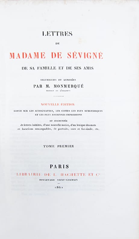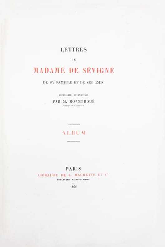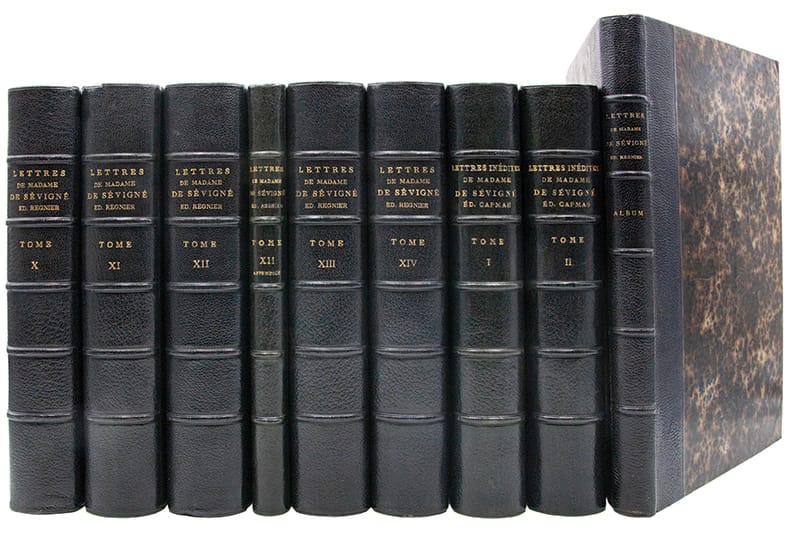 Exemplaire le plus complet de la monumentale édition de référence des Lettres de Madame de Sévigné, établie par Louis Monmerqué dès 1818, reprise et augmentée par la librairie Hachette sous la direction dAdolphe Régnier, dans le cadre de la "Collection des Grands Écrivains de la France". Elle repose sur lexploitation des exemplaires interfoliés annotés par Monmerqué ainsi que sur des sources alors inédites.Le corpus se compose de quinze volumes et d'un volume d'appendice au tome XII ("additions et corrections") auxquels sajoutent deux tomes de "lettres inédites" recueillies par Charles Capmas et publiées en 1876.Lensemble est complété par un rare album iconographique, paru en 1868, réunissant une planche héraldique en couleurs représentant les armoiries des familles Rabutin, Sévigné, Grignan et Simiane, quatre portraits, huit vues de demeures et seize fac-similés dautographes, chaque élément étant accompagné dune notice explicative.Cette édition a été remarquée dès sa parution "pour la pureté du texte, le nombre, lexactitude et la curiosité des notes (); rien, en un mot, na été négligé pour en faire un monument" (Ed. Boutaric, recension in "Bibliothèque de lÉcole des chartes", 1868, XXIX, p. 207-208).De fait, elle se distingue par sa rigueur philologique et la précision de son appareil critique, intégrant un grand nombre de notes historiques et de lettres inédites.Son coût élevé en réservait laccès principalement aux grandes bibliothèques, "la distinguant nettement des éditions abrégées ultérieures, dépourvues dun appareil critique dune telle ampleur". Par son exhaustivité, sa fiabilité et sa profondeur analytique, cette édition demeure aujourdhui encore linstrument de référence indispensable pour létude de la correspondance sévignéenne.Quelques piqûres éparses.Ex-libris armorié imprimé aux armes du Château de Plessis-Brion, demeure de la famille des comtes de Bréda.Très bel exemplaire, établi dans une luxueuse reliure de maroquin, imprimé sur papier vergé fort, non rogné.