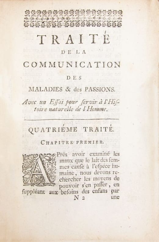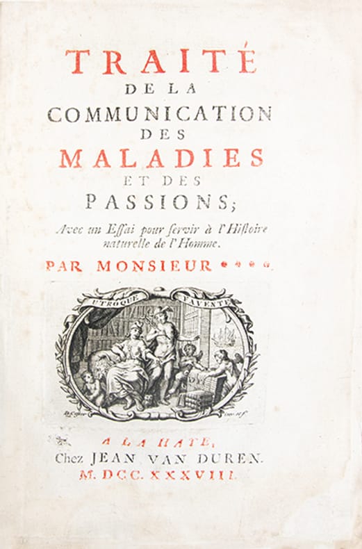 Première et unique édition de ce rare traité médico-philosophique de Louis-Malo Moreau de Saint-Élier, abbé augustinien et frère cadet de Maupertuis.À la croisée de la médecine, de la morale et de lanthropologie, lauteur analyse la "contagion morale" et les interactions constantes entre corps, passions et santé, dans une perspective qui bouscule lhétérodoxie scientifique de son temps. Il soutient que les désordres de lâme peuvent engendrer des maladies, et réciproquement, en étudiant leur transmission selon des mécanismes à la fois physiques et psychologiques. Le traité anticipe certaines thèses développées par La Mettrie dans 'L'Homme-Machine' ; La Mettrie se serait, en outre, inspiré du titre de ce livre pour son 'Histoire naturelle de lâme' (1745), selon Aram Vartanian (cf. 'Le frère de Maupertuis et lhomme machine', "Dix-huitième Siècle", n°14, 1982).Rares rousseurs ; quelques piqûres éparses ; petite restauration au coin inférieur de la page de titre. Bon exemplaire sous sa brochure dattente dorigine titrée à la plume à lépoque.