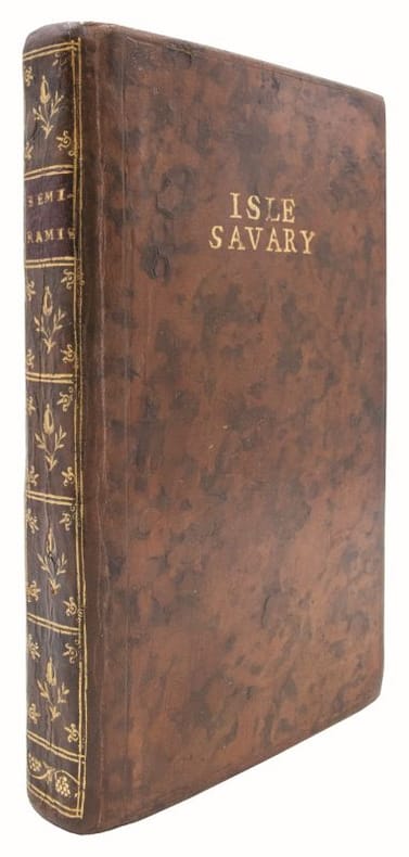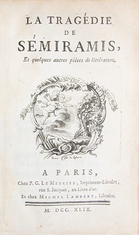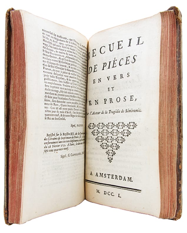 Recueil de deux ouvrages de Voltaire publiés chez Michel Lambert et reliés à l'époque.1- Première édition de ce recueil, composé des textes que le sous-titre annonce comme n'ayant "point encore paru". Il s'ouvre sur la "Dissertation sur la tragédie ancienne et moderne", importante déclaration de méthode confrontant le modèle grec aux exigences de la scène française et l'un des essais théâtraux les plus substantiels de l'auteur. Elle est suivie de la tragédie de "Sémiramis", créée à la Comédie-Française en août 1748. Le volume se complète par "Des mensonges imprimés", pamphlet contre les falsifications dont Voltaire s'estimait victime, et par " L'Éloge funèbre des officiers morts dans la guerre de 1741 ".(Bengesco, n° 182. Voltaire à la BnF, n° 1442.)2- Première édition collective de ce recueil publié par Lambert à Paris sous la fausse adresse d'Amsterdam, composé fin 1749 selon Bengesco et Beuchot. Il réunit les six "Discours en vers sur l'homme" dans leur version remaniée, précédés d'un avertissement de l'éditeur ; "Memnon", conte philosophique distinct de "Zadig" ; "Sur l'encouragement des arts" ; "Le Temple de l'amitié" ; "Des Embellissements de Paris", essai urbanistique plaidant pour la rénovation de la capitale, ici en édition originale ; et "Babouc, ou le Monde comme il va", première édition sous ce titre.(Bengesco, n° 630. Voltaire à la BnF, n° 2277.)Exemplaire provenant de la bibliothèque du château de l'Isle-Savary (mention dorée sur le premier plat). Ancienne forteresse du Bas-Berry, dont la construction remonte à la seconde moitié du XVe siècle, il fut la demeure de la famille de Savary.Petites traces de restauration à la reliure. Exemplaire légèrement gauchi.Très bon exemplaire, bien relié à l'époque.