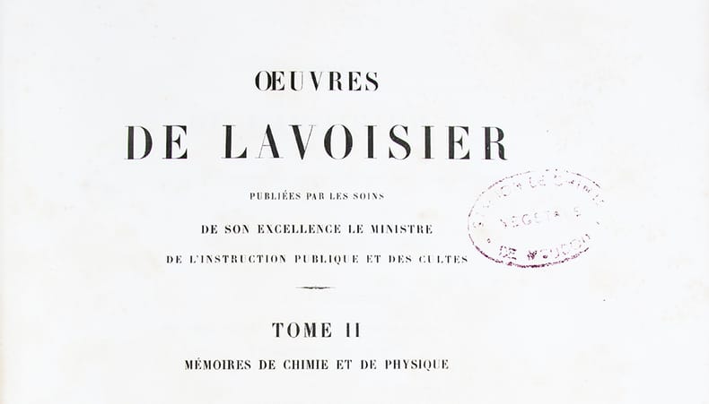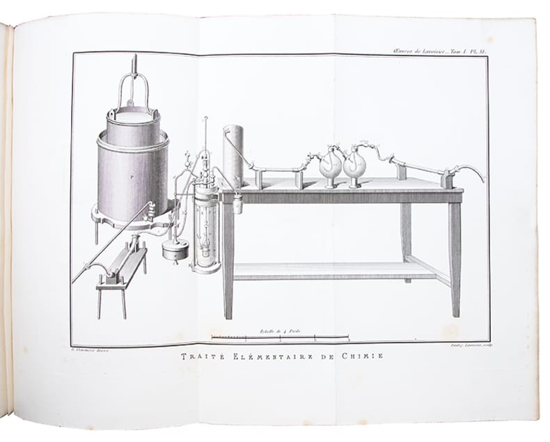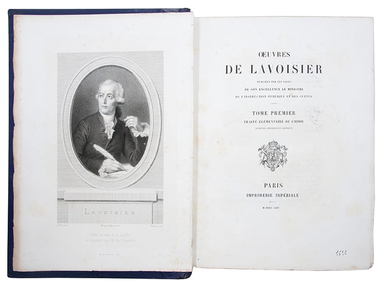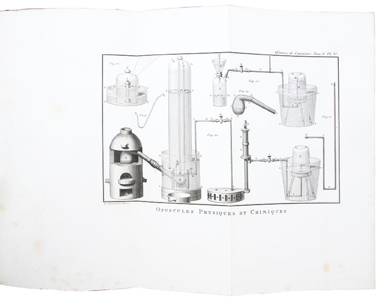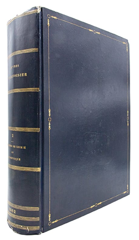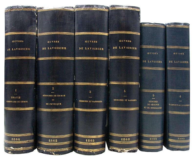 Rare ensemble complet de cette monumentale publication décidée par l'État en 1861 à l'initiative de Jean-Baptiste-André Dumas, président de l'Académie des sciences. Le tome II parut avant le tome I.I- Traité élémentaire de chimie. Opuscules physiques et chimiques, 1864, portrait, (4), XI, 728 pages, 16 planches dépliantes.II- Mémoires de chimie et de physique, 1862, (4), 828 pages, 8 planches dont 1 dépliante.III- Mémoires et rapports sur divers sujets de chimie et de physique pures ou appliquées à l'histoire naturelle générale et à l'hygiène publiques, 1865, (4), 795 pages, 12 planches dont 10 dépliantes.IV- Id. Pièces relatives à l'histoire de l'Académie et au Bureau de consultation des Arts et Métiers, 1868, (4), 775 pages, 4 planches doubles.V- Mémoires de géologie et de minéralogie. Notes et mémoires divers de chimie. Mémoires scientifiques et administratifs sur la production du salpêtre et sur la régie des poudres, 1892, (4), III, 749 pages, 12 planches dépliantes.VI- Rapports à l'Académie, notes et rapports divers. Économie politique, agriculture et finances, Commission des poids et mesures, 1893, (4), III, 717 pages, 2 planches.(Duveen & Klickstein, n° 338 à 690. Martin & Walter, III, 19849).Timbre de la "Station de chimie végétale de Meudon", laboratoire fondé et dirigé par le chimiste et ministre Marcellin Berthelot (1827-1907).Accros aux coiffes et légers frottements sur les plats et aux coins des premiers volumes, quelques rousseurs aux premiers feuillets et aux planches.Bon exemplaire des oeuvres complètes du père de la chimie moderne, imprimé sur grand papier fort, doté dune provenance significative, en reliure d'époque, très grand de marges.